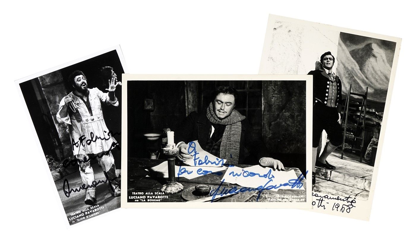 Dediche a pennarello nero e azzurro. Una fotografia con timbro al retro Copyright by Piccagliani Teatro alla Scala. Tutte le foto con iscrizione Teatro alla Scala. Dimensioni varie.