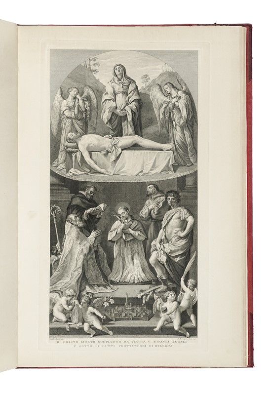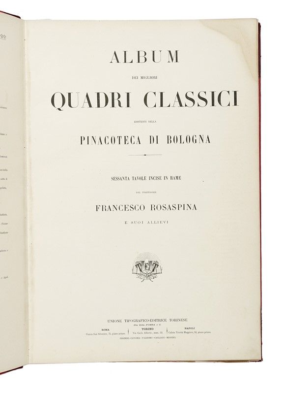 In-folio (mm 457x320). Pagine: 11, seguite da 60 tavole calcografiche protette da veline (talora un po’ gualcite o con qualche strappetto). Testo bilingue in italiano e in francese su due colonne. Occhiello ingiallito, trascurabile alone all’angolo superiore. Nel complesso buona copia completa in mezzo marocchino rosso coevo con angoli, grande titolo in oro al piatto anteriore, dorso con tassello e fregi dorati (qualche sbucciatura alle estremità e altre tracce d’uso).