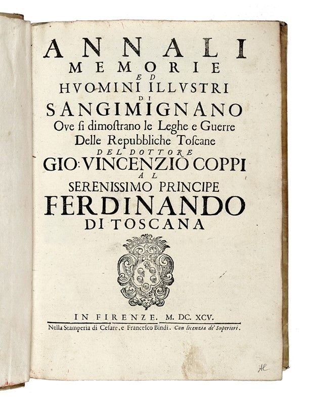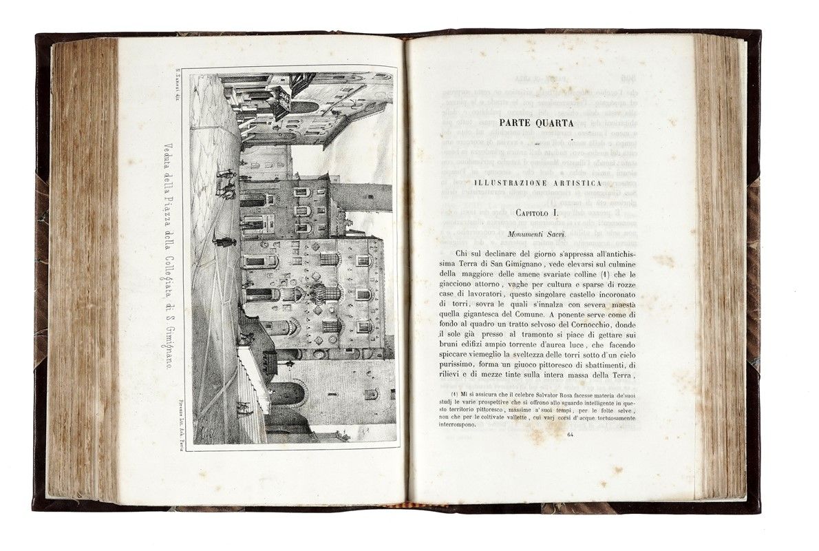 In-4° (mm 240x180). Pagine [16], 408, 250, [2]. Stemma del dedicatario al frontespizio; capilettera xilografiche. Buona copia, leggermente rifilata, con qualche fioritura sparsa, rarissime bruniture e un impercettibile restauro al frontespizio. Legatura in piena pergamena con titoli manoscritti al dorso e tagli rossi. Ex-libris al contropiatto anteriore. SI AGGIUNGE: Pecori Luigi, Storia della terra di San Gimignano... Firenze: Tip. Galileiana, 1853.