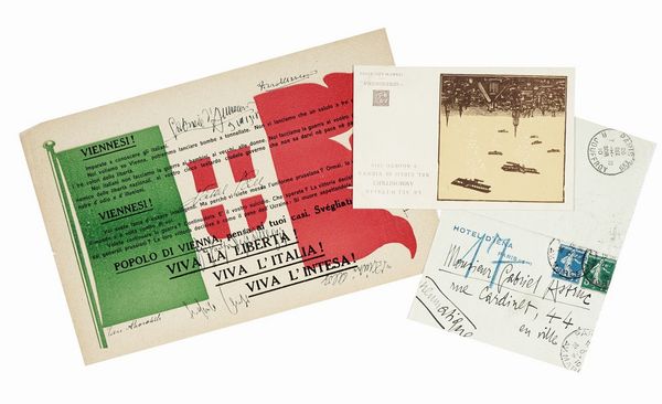 Manoscritto in francese a penna nera. Testo scritto su foglio dentellato di Poste pneumatique viaggiato, intestato Hotel d’Iena, Paris 16ème. Al recto il testo, al verso l’indirizzo autografo, francobolli e timbri. Dimensioni 115x155 mm. SI AGGIUNGONO: 1 cartolina postale commemorativa del Volo su Vienna (1918), con immagine in beige e marrone, ed. Arti Grafiche G. Zanetti Milano; 1 copia anastatica del volantino tricolore lanciato su Vienna con le firme dei partecipanti all’impresa (testo in italiano); 1 Bollettino ufficiale del Comando di Fiume d’Italia / La Reggenza del Carnaro MCMXX; 1 copia del giornale Patria del Popolo sindacalista dannunziano, settimanale del 2.11.1922 (Milano), completo (4 pagg.) che contiene l’articolo L’alto monito di Gabriele d’Annunzio alla giovinezza italiana.