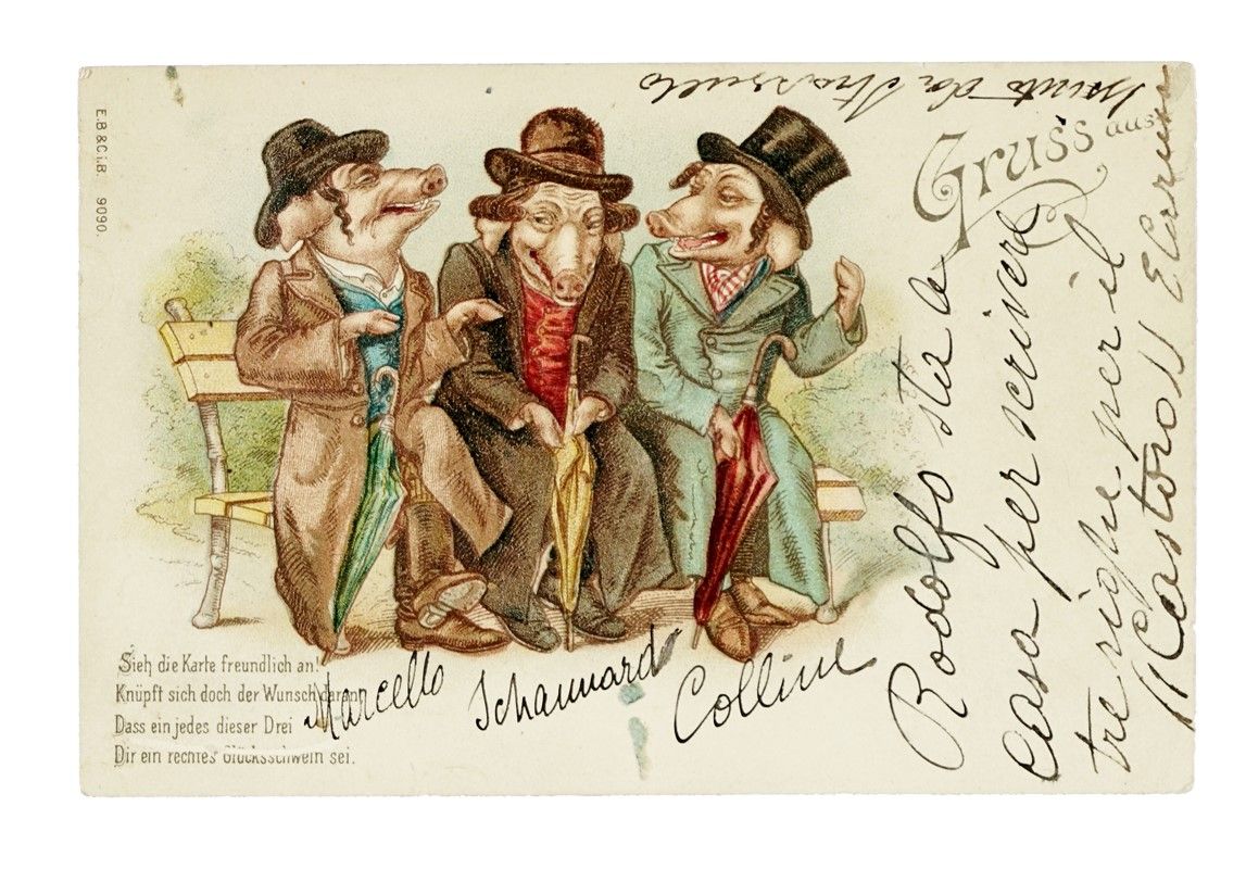 Manoscritto a inchiostro nero. La cartolina raffigura tre porcellini. Dimensioni 90x140 mm.