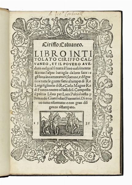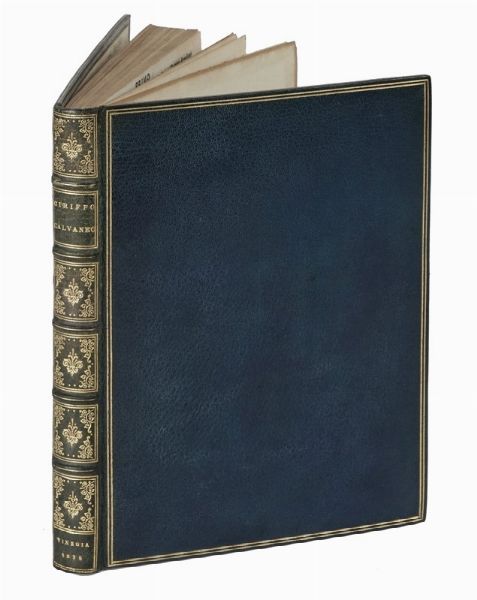 In-4° (mm 203x141). Carte: [140]. Bellissimo frontespizio entro ampia cornice floreale e con vignetta, testo su due colonne con oltre settanta vignette xilografiche (varie ripetute). Carte uniformemente ingiallite ma ottima copia in marocchino blu di fine Ottocento, piatti riquadrati da doppio filetto, dorso a nervi riccamente decorato in oro (un po' sbiadito), unghiatura e dentelles dorate, tagli dorati. Antica firma di appartenenza di Jacopo Corbinelli (verosimilmente lo scrittore fiorentino, 1535-1590 ca); nota di passaggio da Bernard Quaritich.