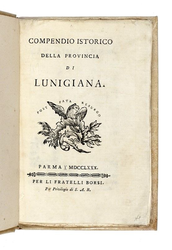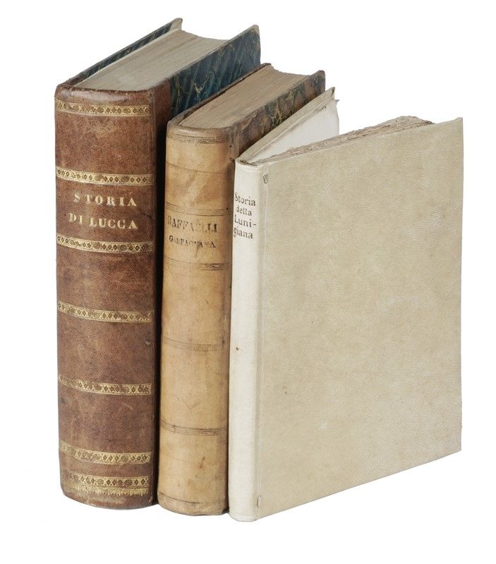 In-8° (mm 195x130). Pagine 223, [1]. Marca xilografica al frontespizio, con graziose vedutine a mo' di testatina e capilettera in legno. Copia in barbe, diffusamente fiorita, con strappi restaurati e una marginalissima e impercettibile integrazione al margine superiore del frontespizio (rimontato). Legatura coeva in piena pergamena rimontata, con titoli manoscritti al dorso e sguardie rinnovate. SI AGGIUNGE: Raffaelli Raffaello, Descrizione geografica storica economica della Garfagnana. Lucca: Giusti, 1879. SI AGGIUNGE: Tommasi Girolamo, Sommario della Storia di Lucca dall'anno MIV all'anno MDCC, compilato su documenti contemporanei [...] continuato sino all'anno 1799 e seguito da una scelta degl'indicai documenti per cura di Carlo Minutoli. Volume unico. Firenze, Viesseux, 1847. Lotto non passibile di restituzione.