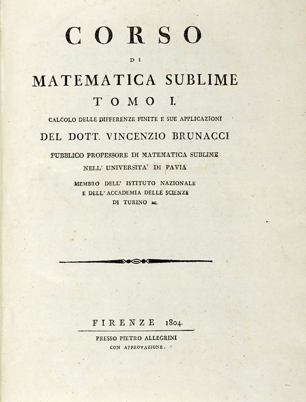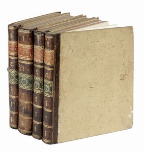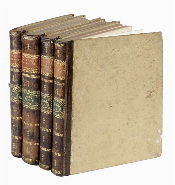 4 volumi in-4° (mm 270x200). Marca calcografica al frontespizio. Legatura in mezza pelle, con piatto in carta rustica, fregi e titoli in oro al dorso. Abrasioni ai piatti e punte stanche. Annotazione e timbro di appartenenza al frontespizio e al foglio di guardia anteriore. Collazione disponibile su richiesta.