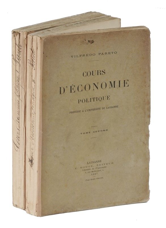 2 volumi in-8° (mm 240x150). Pagine VIII, 430; IV, 426. Rare fioriture, altrimenti buona copia in barbe, leggermente allentata. Annotazione e modifiche al testo di differente mano. Brossura con piatti dell'edizione originale rimontati e dorso rinnovato, con titoli manoscritti. Mancanze e difetti al dorso, parzialmente allentato, macchie e tracce d'uso ai piatti. Con la dedica autografa di Pareto a Vittorio Racca al frontespizio del secondo volume.