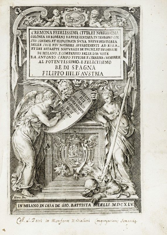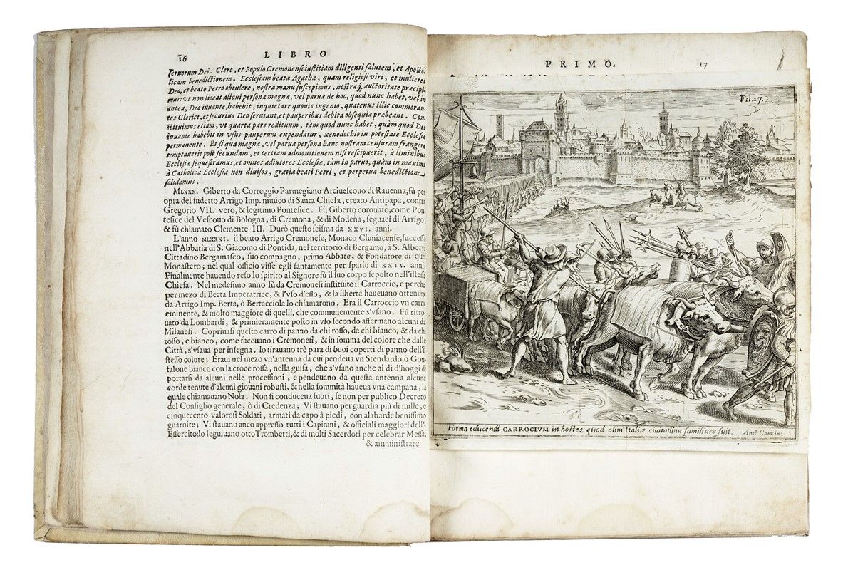 In-4° (mm 261x205). Pagine [8], 228 [i.e. 224]; 32, [24]. Frontespizio calcografico. Con 1 grande pianta di Cremona ripiegata e 6 incisioni a piena pagina o ripiegate. Nel testo, inoltre, numerosi ritratti incisi. Le tavole e la pianta presentano strappi richiusi e piccole mancanze d'inciso, alcune fioriture e bruniture ai fascicoli, alcuni salti nella numerazione delle pagine, senza perdite. Alcune tavole risultano rimontate al contrario. Mancante la pianta del territorio ripiegata. Legatura successiva in piena pergamena muta. Piatti e dorso macchiati. Lotto non passibile di restituzione.