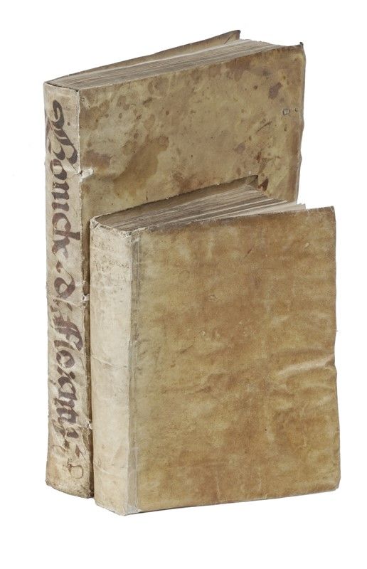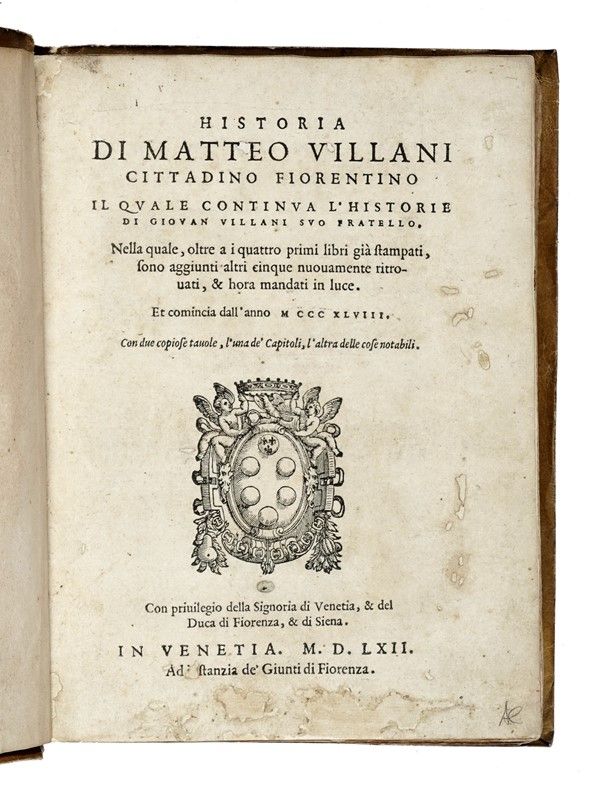 In-folio (mm 315x215). Carte [10], 220 con incisione xilografica raffigurante un putto al frontespizio e al colophon. Copia con lievi gore marginali, un forellino di tarlo che non coinvolge l'inciso alla carta 2E4 e uno strappetto restaurato al frontespizio, con un rinforzo di nastro adesivo al margine interno. Postille di differente mano ai margini del testo. Legatura in pergamena, con titoli manoscritti al dorso; macchie ai piatti. Ex-libris al contropiatto anteriore. SI AGGIUNGE: Villani Matteo, Historia [...] nella quale oltre i quattro primi libri già stampati, sono aggiunti altri cinque nuovamente ritrovati... In Venetia: ad instanzia de' Giunti di Fiorenza, 1562.