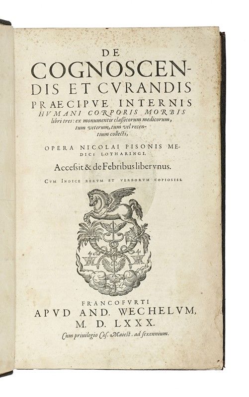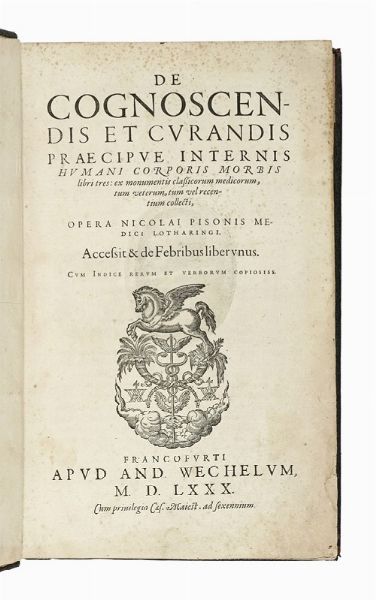 In-folio (mm 315x192). Pagine [16], 477, [15]. Grande marca incisa in legno al frontespizio e ritratto dell'Autore in ovale al verso, capilettera e testatine xilografici. A p. 429 inizia con proprio frontespizio il De febribus. Esemplare un po' ingiallito e con fioriture sparse in marocchino verde settecentesco con doppia filettatura dorata ai piatti e titoli impressi in oro al dorso, un po' usurato.