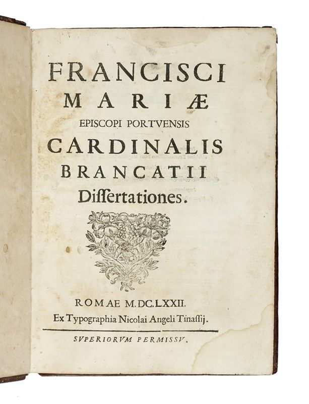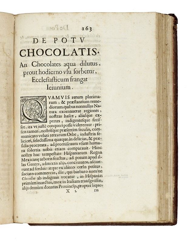 Si trova alle pp. 163-211 delle Dissertationes del Brancaccio, in-folio piccolo (mm 264x188). Pagine: [6] 358 (assente l'ultima carta di testo, ma il De potu chocolatis è completo). Carte occasionalmente fiorite o ingiallite in modo pallido, qualche lieve alone marginale. Il De potu chocolatis si apre con una tavola calcografica. Vitellino coevo, dorso a nervi con titolo e decorazioni dorate (mancanze alla testa, al piede e lungo le cerniere, abrasioni alle estremità), unghiatura dorata, contropiatti marmorizzati.