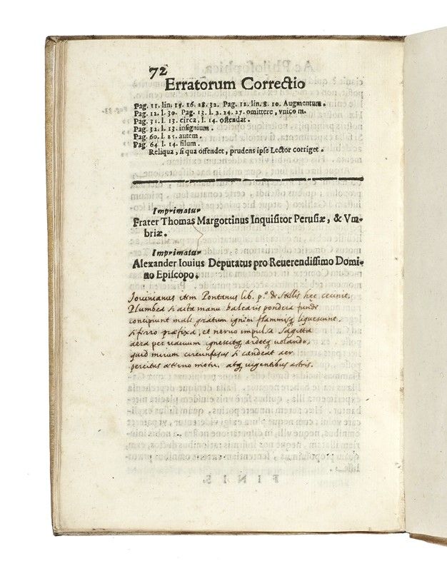 [RILEGATO CON:] Grassi Orazio, Libra astronomica ac philosophica qua Galilaei Galilaei opiniones de cometis a Mario Guiducio in Florentina Academia exposiae... Perusiae: ex typographia Marci Naccarini, 1619. In-4° (mm 207x148). Pagine: 15, [1]; 72. Con una grande tavola calcografica ripiegata nella prima opera, raffigurante varie costellazioni. Fregi e iniziali xilografiche nel testo. Seconda opera con cornice tipografica e vignetta calcografica al frontespizio, e con molte vignette e diagrammi xilografici nel testo. Prima opera con sottile macchia d'inchiostro al margine superiore e altra pallida macchiolina a quello inferiore; seconda opera con il testo pallidamente arrossato in alcuni punti, ma nel complesso copia molto buona in pergamena flessibile coeva con titolo "Sopra Comete" manoscritto lungo il dorso e altro titolo al margine inferiore. In margine alla p. 76, un'antica nota manoscritta (un po' rifilata), ripetuta però al verso dell'ultima carta, relativa al De stellis di Giovanni Gioviano Pontano.