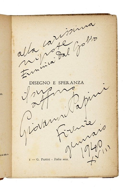 Le dediche e i libri sono: Giovani Papini. Dante vivo. Firenze, Libreria Editrice Fiorentina 1933. Dedica: alla carissima / Mamma / col ricordo degli anni / lontani e con tutti gli auguri / del suo aff.mo / Giovanni / Pasqua / 1933 - Giovani Papini. Storia della letteratura italiana (volume primo). Firenze, Vallecchi 1937. Dedica: alla cara / nipotina / Erminia / cogli auguri affettuosi / del suo / Giovanni Papini / Firenze / ottobre / 1937 [...] – Giovani Papini. Grandezze di Carducci. Firenze, Vallecchi 1935. Dedica: alla mia carissima / Mamma, nel suo genetliaco, cogli auguri affettuosi / di pronta guarigione / Giovanni / 6 giugno 1935. Al volume manca il piatto superiore. – Giovani Papini. Dante vivo. Firenze, Libreria Editrice Fiorentina 1933. Dedica: alla carissima / Sofia e alla sua / Erminia / il suo / Giovanni – Giovani Papini. Italia mia. Firenze, Vallecchi 1939. Dedica: alla carissima / nipote / Erminia Dal Gobbo / il suo / aff.mo / Giovanni Papini [...] – Giovani Papini. Figure umane. Firenze, Vallecchi 1940. Dedica: a Erminia Dal Gobbo / cogli affettuosi / auguri / del vecchio zio / Giovanni Papini [...] – Giovani Papini. La pietra infernale. Brescia, Morcelliana 1934. Dedica: alla cara e brava / nipote Erminia / per memoria / del suo aff.mo / Giovanni Papini [...].