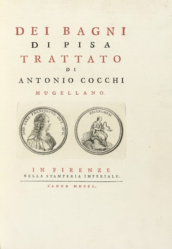 In-4° (mm 288x215). Pagine [12], 415, 1 bianca + 7 tavole fuori testo ripiegate, delineate da M. Piazzini, G. Ruggeri, G. Zocchi e incise in rame da Nicolò Mogalli. Frontespizio in rosso e nero con sotto 2 medaglie incise in ovale e vignette nel testo. Splendido, marginoso esemplare impresso su carta forte con le tavole in ottimo stato conservativo. Rare fioriture. Legatura in piena pelle, con titoli in oro al dorso a 6 nervi, tagli dorati, dentelles e sguardie marmorizzate. Tracce d'uso e lievi abrasioni. SI AGGIUNGE: Id., Dei discorsi toscani [...]. Parte prima (-seconda). In Firenze: appresso Andrea Bonducci, 1761. 2 volumi in-4° (mm 222x165). Con una tavola tipografica ripiegata fuori testo, ma scompleto dell'antiporta calcografica. Legatura coeva in piena pergamena, con titoli in oro su tassello al dorso e tagli spruzzati.