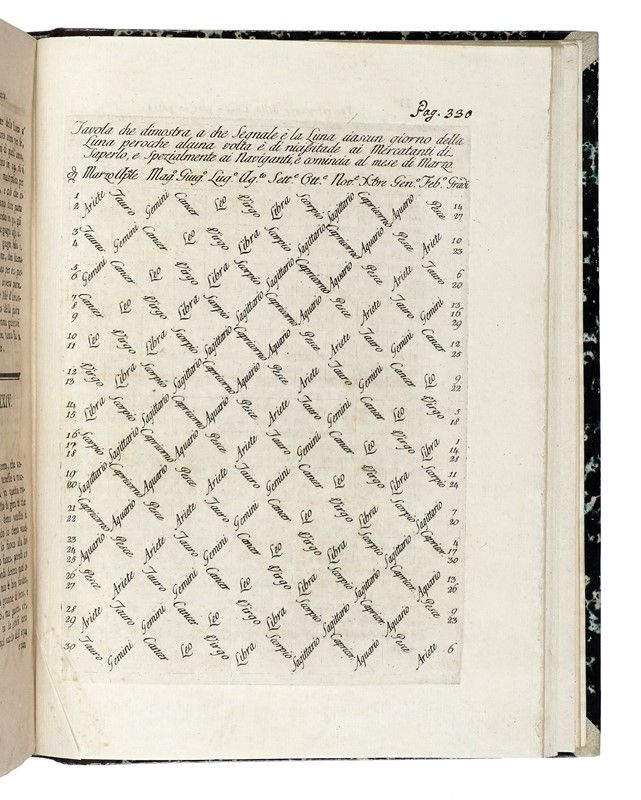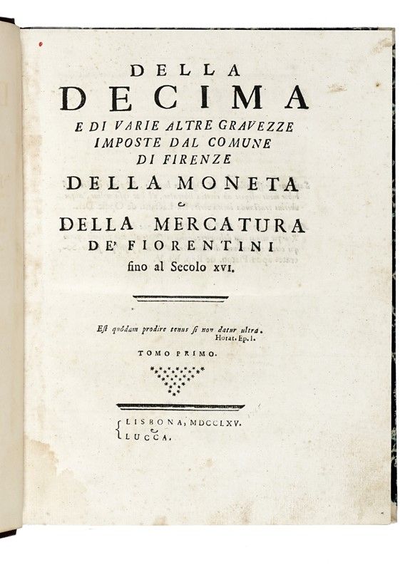 4 volumi in-4° (mm 270x200). Pagine [2] (di 6?), III-VIII, 268, XII; VI, 355, [1]; XXIV, 380; [2], XXXVI, [2] (di Alfabeto) 284. Con 5 carte di tavole ripiegate al primo volume e 1 che dimostra a che Segnale è la Luna ciascun giorno... al terzo. Capilettera in legno. Mancante la carta π1 bianca al secondo volume, al quale è stato rilegato il fascicolo χ² contenente la dedica al granduca di Toscana Pietro Leopoldo d'Austria firmata da G. Bouchard. Copia diffusamente brunita e gorata (marginalmente anche alle tavole) con un rinforzo al margine interno del frontespizio del primo volume. Legatura successiva in mezza pelle con piatti marmorizzati, fregi e titoli in oro al dorso; sguardie rinnovate. Minime tracce d'uso. Nota di possesso manoscritta al foglio di guardia anteriore del primo volume. SI AGGIUNGE: Peruzzi Simone Luigi, Storia del commercio e dei banchieri di Firenze in tutto il mondo conosciuto dal 1200 al 1345... Firenze: Cellini, 1868.