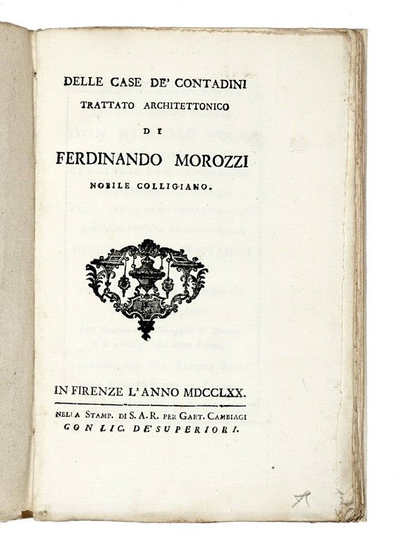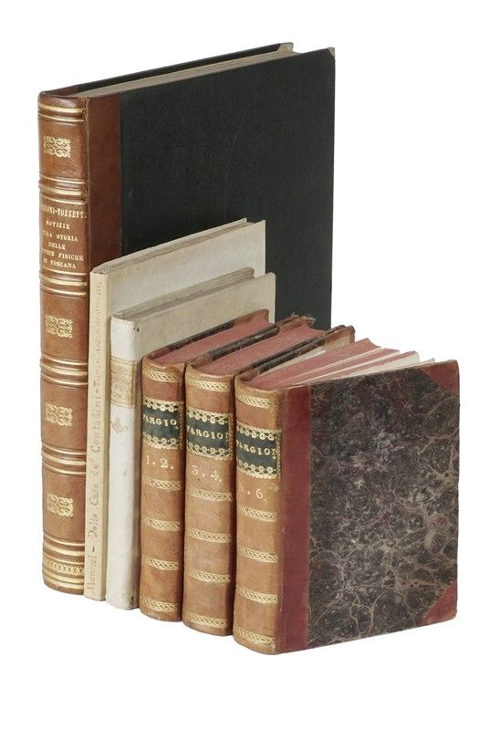 In-8° (mm 214x145). Pagine VI, 87, [1], con 3 tavole calcografiche fuori testo, ripiegate e rilegate in fine, incise da J. Verkruys e da G. Canocchi su disegni dello stesso Morozzi. Esemplare in barbe, con fioriture sparse, una gora marginale a gran parte del volume e parzialmente incollato il margine interno delle pagg. 6-7. Legatura in carta decorata muta, con sovraccoperta con titoli manoscritti al dorso. SI AGGIUNGE: Targioni Tozzetti Ottaviano, Lezioni di agricoltura specialmente toscana [...]. Tomo I (- VI). Firenze: presso Guglielmo Piatti, 1802-1804. SI AGGIUNGE: Targioni Tozzetti Giovanni, Prodromo della corografia della Toscana... In Firenze: nella stamperia imperiale, 1754. SI AGGIUNGE: Id., Notizie sulla storia delle scienze fisiche in Toscana. Firenze: Biblioteca Palatina, 1852.