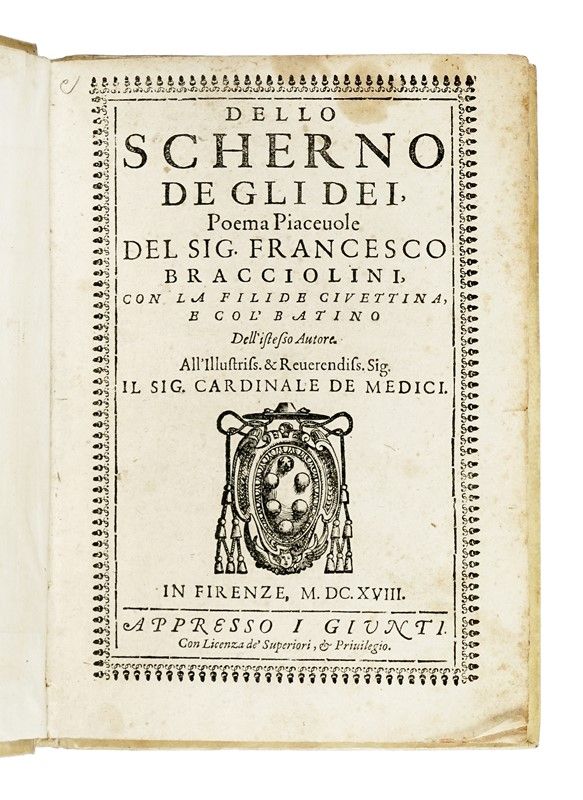 In-4° piccolo (mm 210x142). Pagine: [16], 252 [i.e. 236], [2, assente P8 bianca]. Stemma xilografico del dedicatario al frontespizio, che è in cornice xilografica come anche tutte le pagine di testo, iniziali e finalini xilografici, testo in corsivo. Carte uniformemente ingiallite (un paio brunite), qualche minimo alone marginale, per il resto buona copia in pergamena rigida del Settecento (un po' imbarcata) con tagli decorati di rosso e d'azzurro.