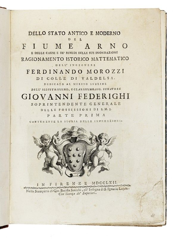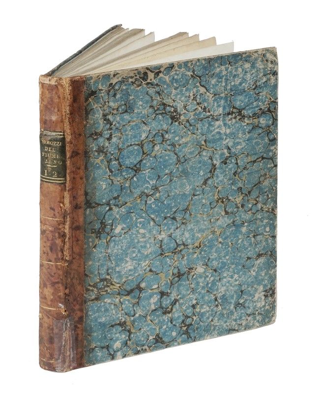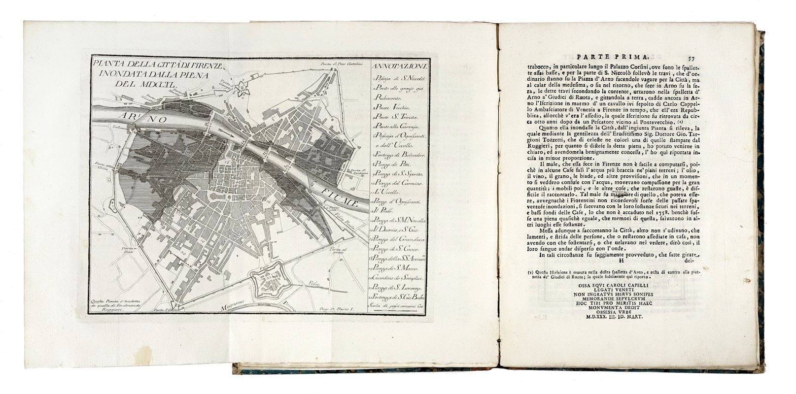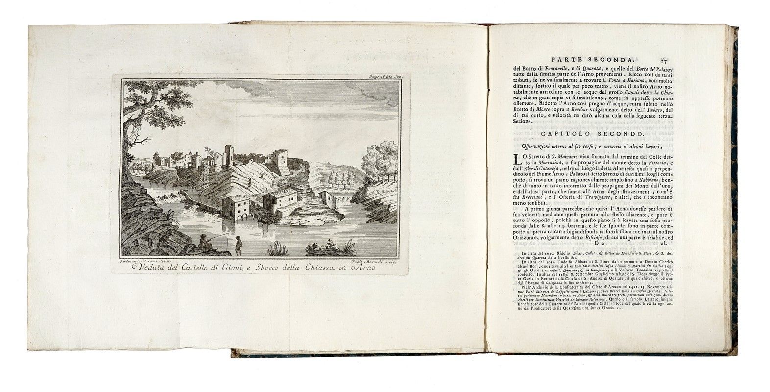 2 parti in un volume in 4° (mm 272x195). Pagine IV, 79, [1]; [2], 124, con 1 pianta della città di Firenze inondata dalla piena del 1740 e 1 tavola più volte ripiegata con la Veduta del Castello di Giovi. Ciascuna parte con proprio frontespizio con marca calcografica. Numerose illustrazioni, anche a piena pagina, nel testo incise in rame. Uno strappo maldestramente restaurato al frontespizio, un forellino di tarlo all'ultima carta della seconda parte e lievi arrossature sparse, altrimenti buona copia. Legatura successiva in mezza pelle con piatti marmorizzati e titoli su tassello al dorso. Difetti alle cerniere, abrasioni ai piatti e punte stanche. Sguardie rinnovate ed ex-libris applicati al contropiatto anteriore.