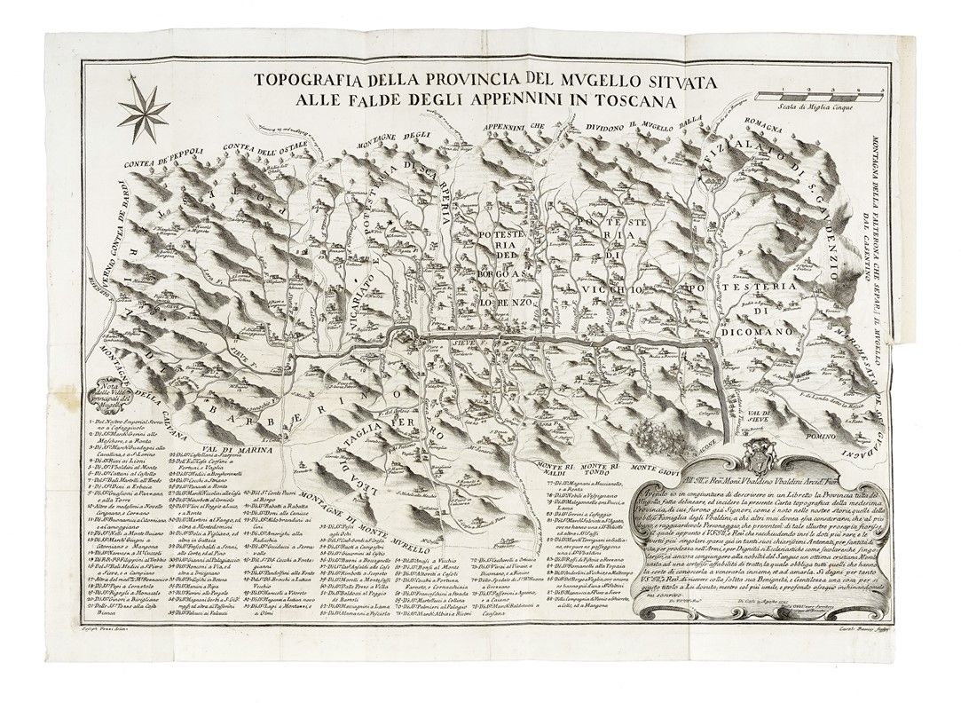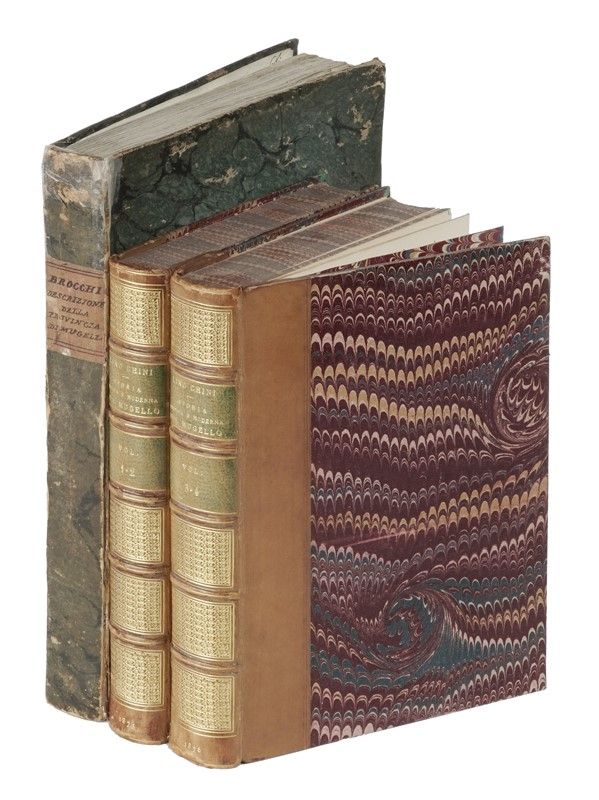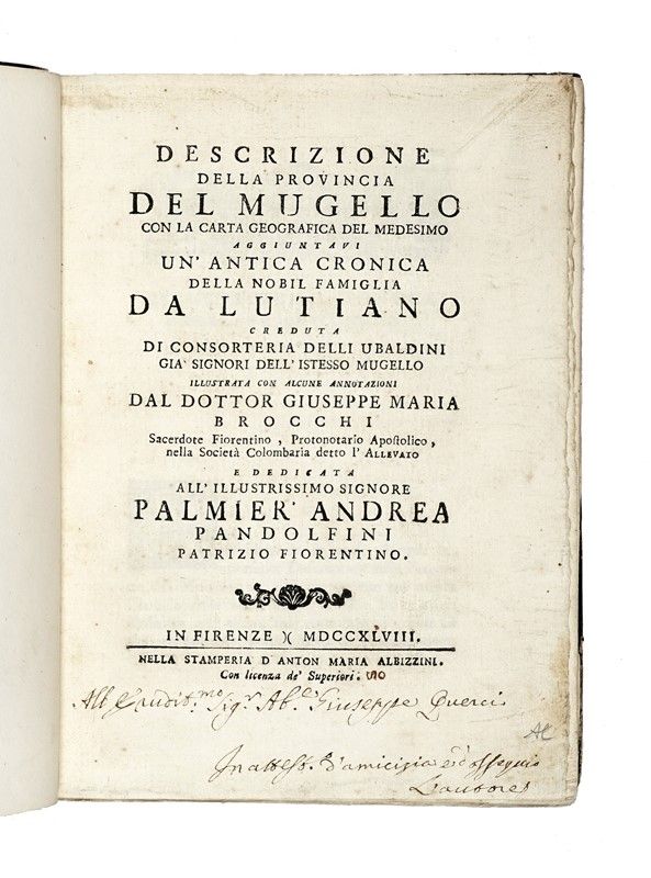 2 parti in 1 volume in-4° (mm 235x175). Pagine XX, 340; 99, 1 bianca + 1 tavola fuori testo più volte ripiegata. Mancanza marginale reintegrata alla carta E4, F2, F3, G1, G3, K3 della prima parte e uno strappo restaurato alla tavola ripiegata, conservata sciolta, altrimenti buona copia in barbe, con lievi fioriture e rare macchie. Legatura cartonato con titolo su tassello al dorso. Abrasioni ai piatti e difetti alle cerniere; sguardie rinnovate. Ex-libris al contropiatto anteriore. Dedica autografa dell'Autore All'Erudit.mo Sig.r Ab.e Giuseppe Querci. In attest.e d'amicizia e d'ossequio.... SI AGGIUNGE: Chini Lino, Storia antica e moderna del Mugello. Firenze: Carnesecchi, 1875-76.
