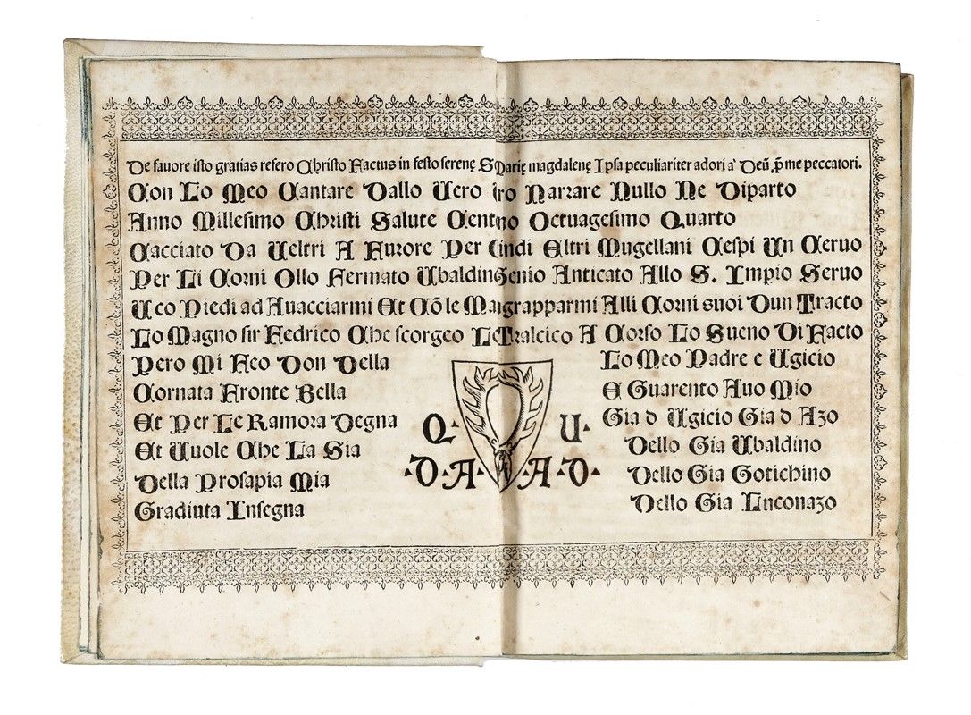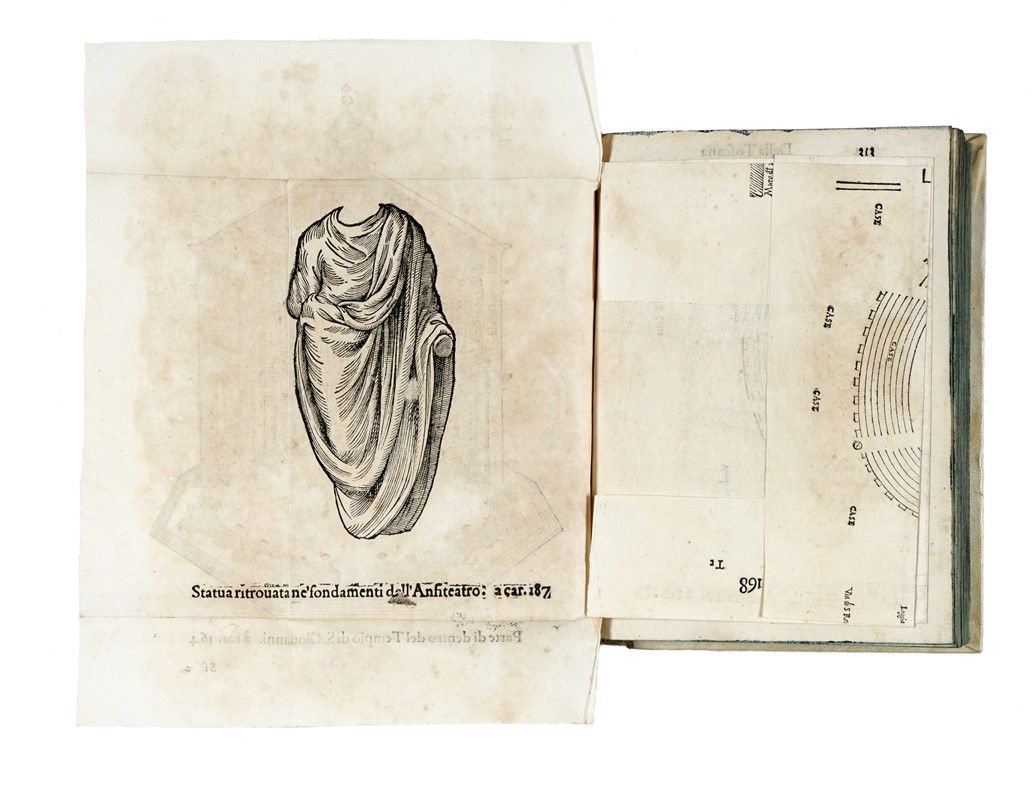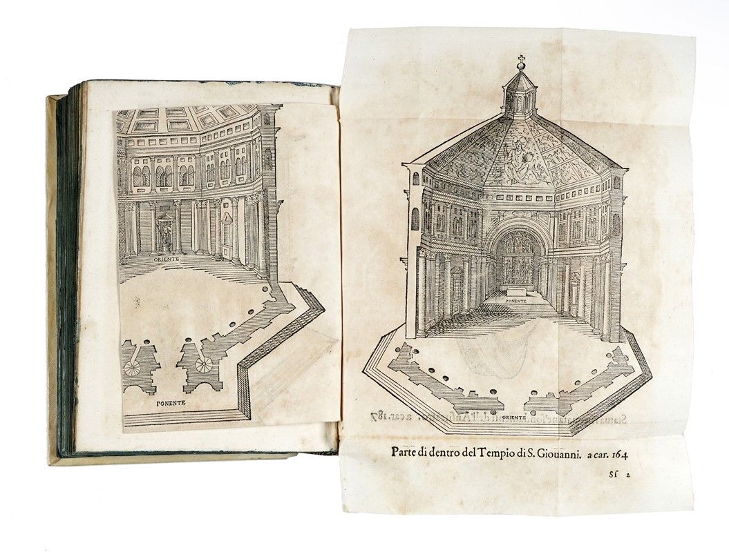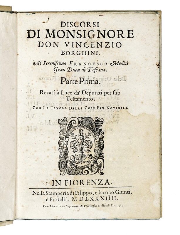 2 volumi in-4° (mm 220x150). Con, complessivamente, 7 tavole fuori testo. Dopo pagina 336 del secondo volume inizia con proprio frontespizio il Trattato della Chiesa e dei vescovi fiorentini. Ritratto dell'Autore inciso al verso dei tre frontespizi, ciascun frontespizio con marca dello stampatore, altra marca tipografica più grande in fine, bei capilettera popolati e alcune illustrazioni nel testo, il tutto xilografico. Copia rifilata, con un'ampia gora al frontespizio e nel testo, un forellino di tarlo senza perdite al primo fascicolo, bruniture diffuse anche alle tavole e altre mende. Legatura in piena pergamena rigida, con titoli impressi in oro su tasselli al dorso e tagli verdi; sguardie rinnovate. Ex-libris al contropiatto anteriore. SI AGGIUNGE: Id., Discorsi con Annotazioni. Parte Prima - (Parte Seconda). In Firenze: appresso Pietro Gaet. Viviani, 1755.