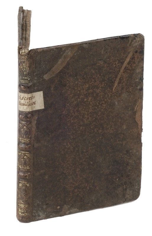 [RILEGATO CON:] Barbieri Niccolò, Trattato sopra l'arte comica... In Genova: per Giuseppe Pauoni, 1627. Due opere in-8° piccolo (mm 138x96). Pagine: 39 [1]; [8]. Margine superiore corto e in un paio di casi rifilato, e altre trascurabili tracce del tempo. Piena pelle coeva, dorso a nervi con scomparti decorati in oro e tassello cartaceo (sbucciature e minime mancanze alle estremità).