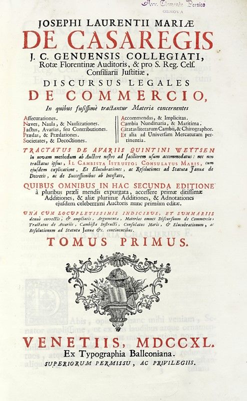 4 tomi in 3 volumi in-folio (mm 374x225). Marca xilografica ai frontespizi stampati in rosso e nero; testatine e capilettera in legno nel testo. Con un ritratto calcografico dell'Autore, inciso da Carlo Orsolini alla carta *6. Diffuse fioriture ed altre macchie, ma nel complesso buona copia. Legatura coeva in piena pergamena, con titoli manoscritti al dorso a 5 nervi. Mancanze al dorso del primo volume, macchie e punte stanche. Timbro di possesso al frontespizio ed ex-libris al contropiatto anteriore.