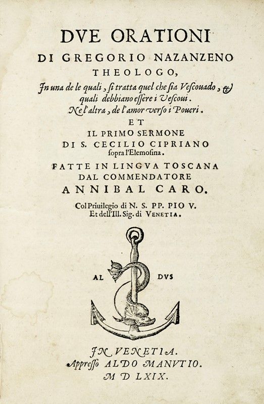 In-4° (mm 207x150). Pagine [8], 146, [2]. Ancora aldina al frontespizio. Copia con lievi e uniformi arrossature e qualche macchiolina sparsa. Uno strappo restaurabile alla carta F1; parzialmente staccata, ma presente, la carta finale di errata. Legatura coeva in piena pergamena floscia con titoli manoscritti al dorso, parzialmente cancellati. Macchie e altre mende.