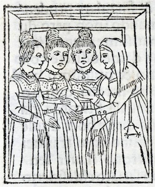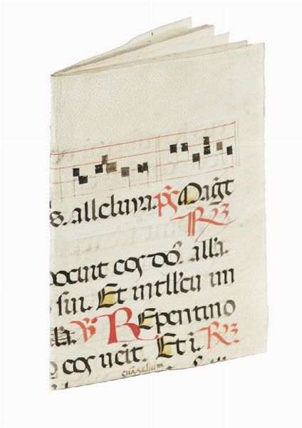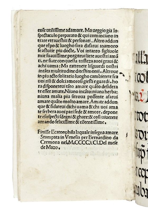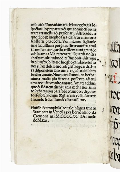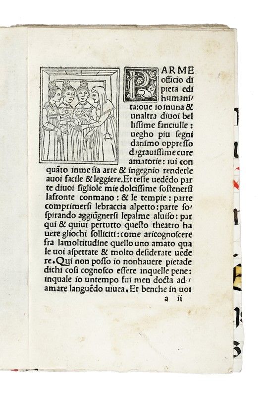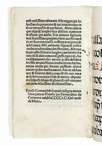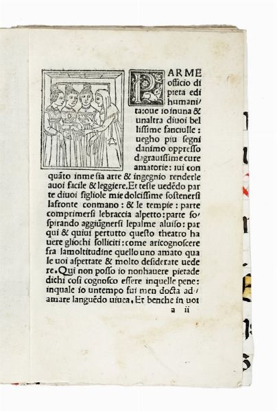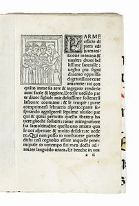 In-8 piccolo (mm 149x96). Segnatura: a-f4. Carte: [24]. Vignetta xilografica all'inizio del testo (carta a2), piccole iniziali xilografiche. Pallidissimo alone al margine inferiore e altre trascurabili tracce del tempo. Modernamente rilegato con un frammento di antico antifonario miniato su pergamena.