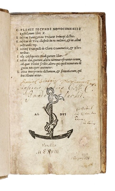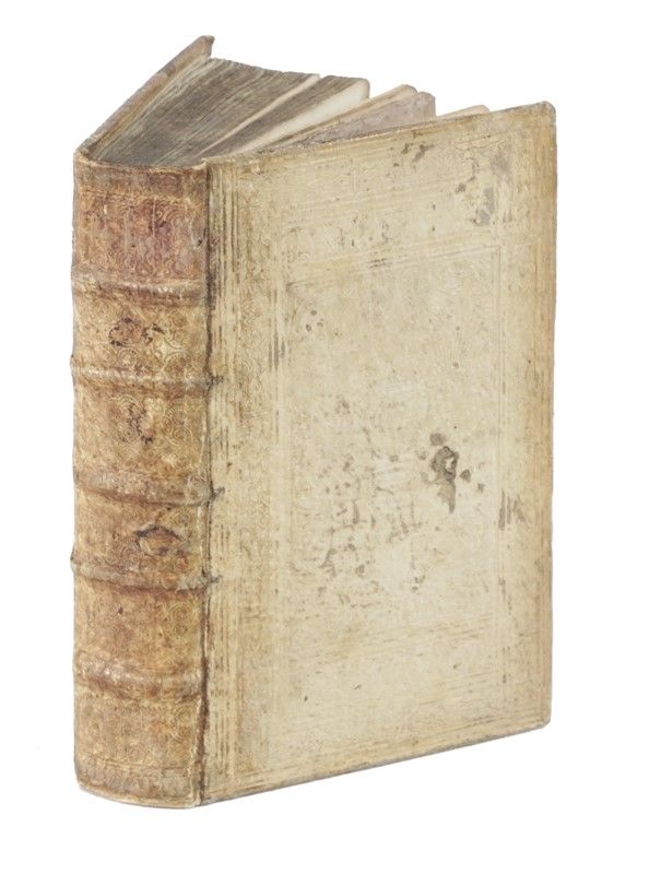 In-8° (mm 162x97). Pagine: [56], 525, [3]. Ancora aldina all'inizio e in fine, testo in corsivo. Frontespizio un po' brunito e con qualche restauro, un forellino alle carte successive, sottile macchietta lungo il margine in alto dei primi fascicoli, alone marginale a q1-2, gora marginale all'angolo inferiore esterno (pallida e discontinua), ma nel complesso affascinante copia con qualche annotazione e sottolineatura coeva, in una legatura cinquecentesca tedesca in pelle di scrofa decorata a secco su assicelle di legno con grandi stemmi ai piatti e data "1569" al piatto anteriore. Ex-libris armoriale inglese di Alexander Trotter, (1755-1842), segretario di Lord Melville (1742-1811), che era a sua volta il luogotenente del primo ministro britannico William Pitt e il politico scozzese più potente alla fine del XVIII secolo.