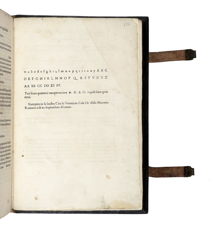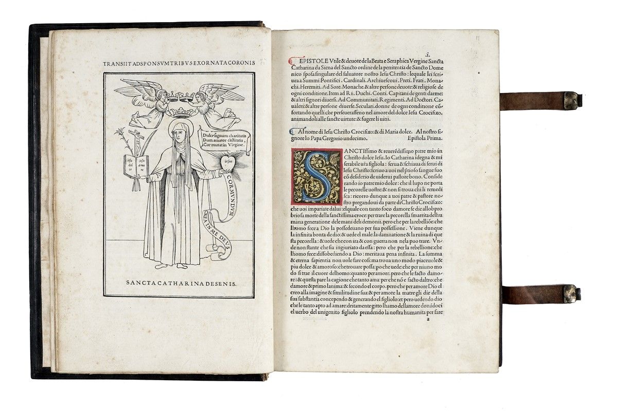 In-folio (307 x 206 mm). [x] ccccxiiii [1] carte, ma in totale 422. Collazionato completo, con la grande F xilografica (6 righe) all'inizio de La Epistola del Beato Certosino colorata in verde, azzurro e giallo, una xilografia a piena pagina di Santa Caterina con inserti tipografici in corsivo e romano a carta *10v, la grande S xilografica (9 righe) all'inizio dell'opera colorata in blu, azzurro, ocra e rosso, segni di paragrafo miniato in rosso o in azzurro all'inizio del volume, piccoli capilettera xilografici. Tracce d'uso e forellini in margine al frontespizio e alle prime e ultime carte, qualche pallida macchiolina in margine, forellino al margine superiore di A3, pallido alone a B7v B8r, ma nel complesso copia ottima in antica legatura decorata in oro e a secco su assicelle di legno con fermagli (minime abrasioni alle estremità), tagli dorati.