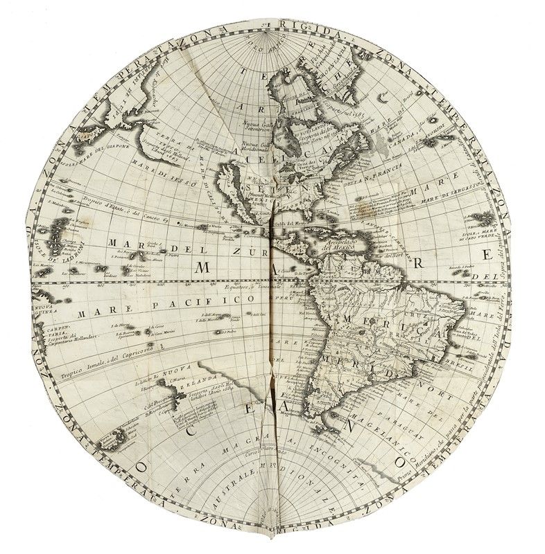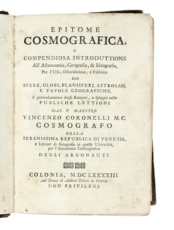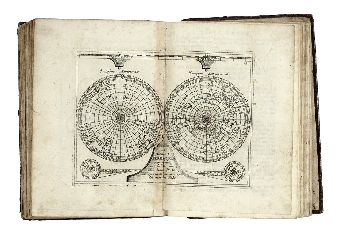 In-8° (mm 183x130). Pagine: [44], 420. Illustrato da un'antiporta allegorica e 36 (su 38) tavole a doppia pagina montate su brachette. Sono assenti due planisferi ripiegati e il ritratto dell'Autore (presente iun alcune copie, ma non nell'elenco alla fine del libro). Pallidi aloni, gora all'angolo delle ultime carte, volvelle non funzionante e planisferi con strappi (ma senza mancanze), cerniera posteriore spaccata e piatto posteriore quasi sciolto. Piena pelle coeva con dorso riccamente decorato in oro (molti sciupata).