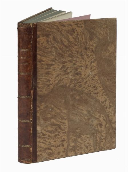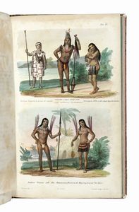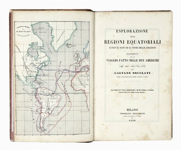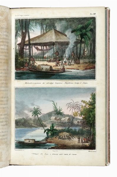 In-4° piccolo (mm 260x165). Pagine 320 + 1 carta geografica raffigurante l'itinerario dell'Autore in antiporta, 1 grande carta litografica più volte ripiegata rappresentante il Corso del Rio Napo e 11 (di 13?) splendide tavole litografiche in coloritura, raffiguranti costumi tribali, villaggi e località amazzoniche. Diffuse e usuali fioriture e 1 strappo restaurato senza mancanze alla carta ripiegata. Legatura coeva in mezza pelle, con piatti marmorizzati e titoli al dorso; sguardie rosa e tagli bli. Tracce d'uso alle cerniere.
