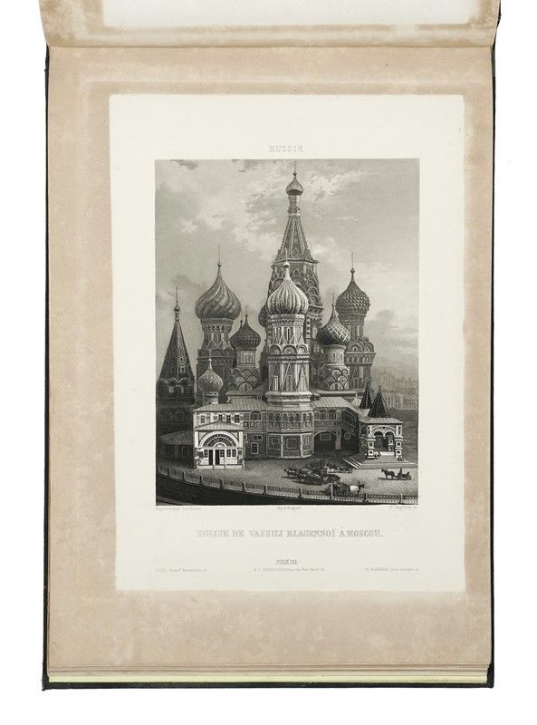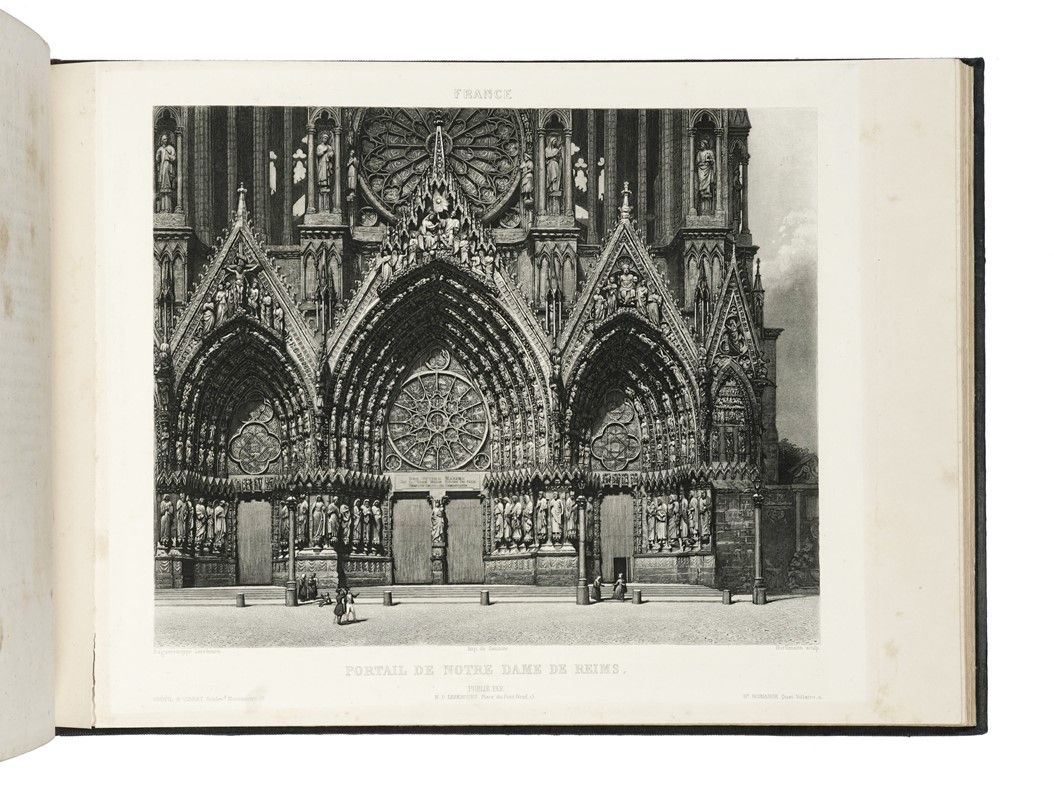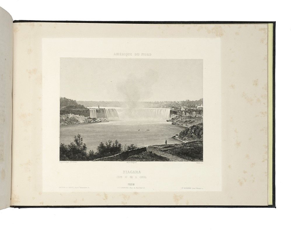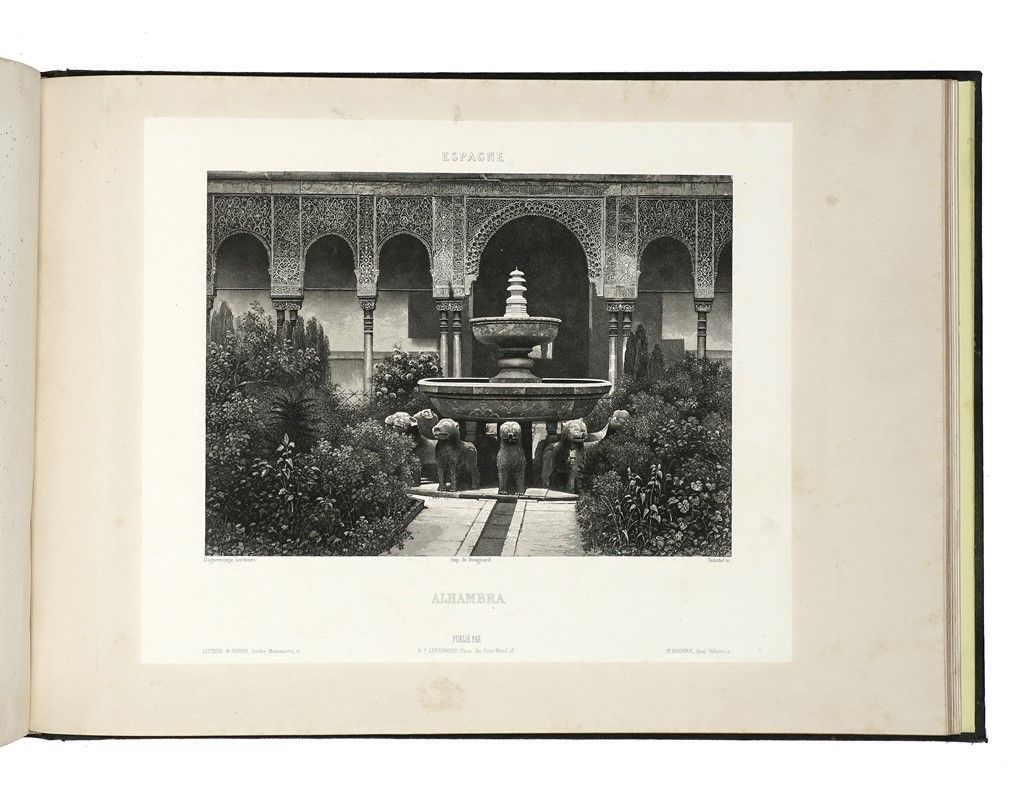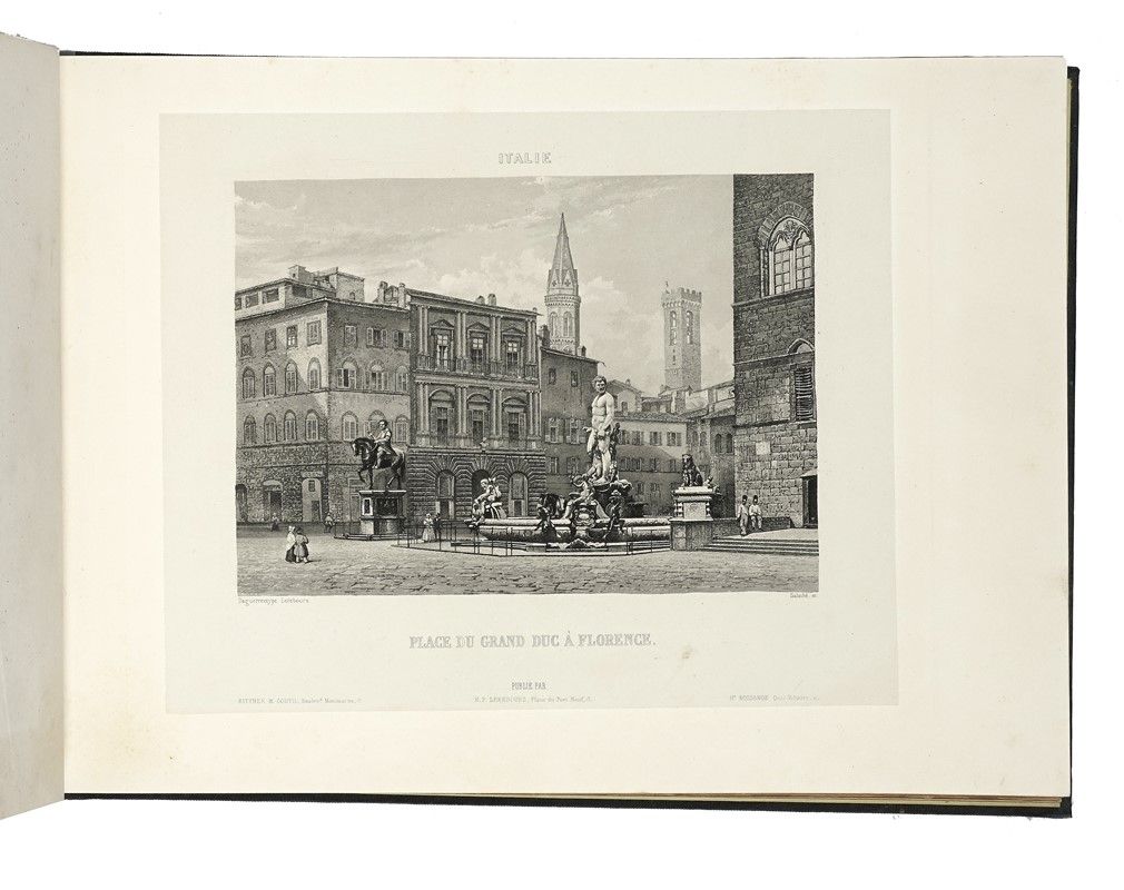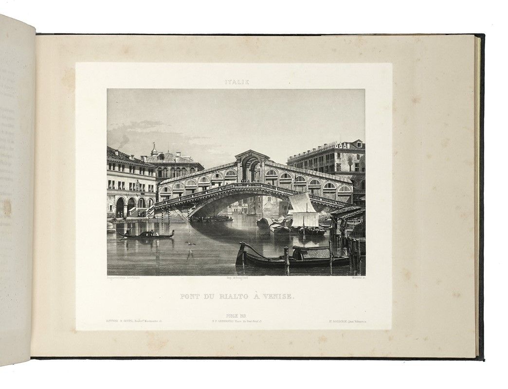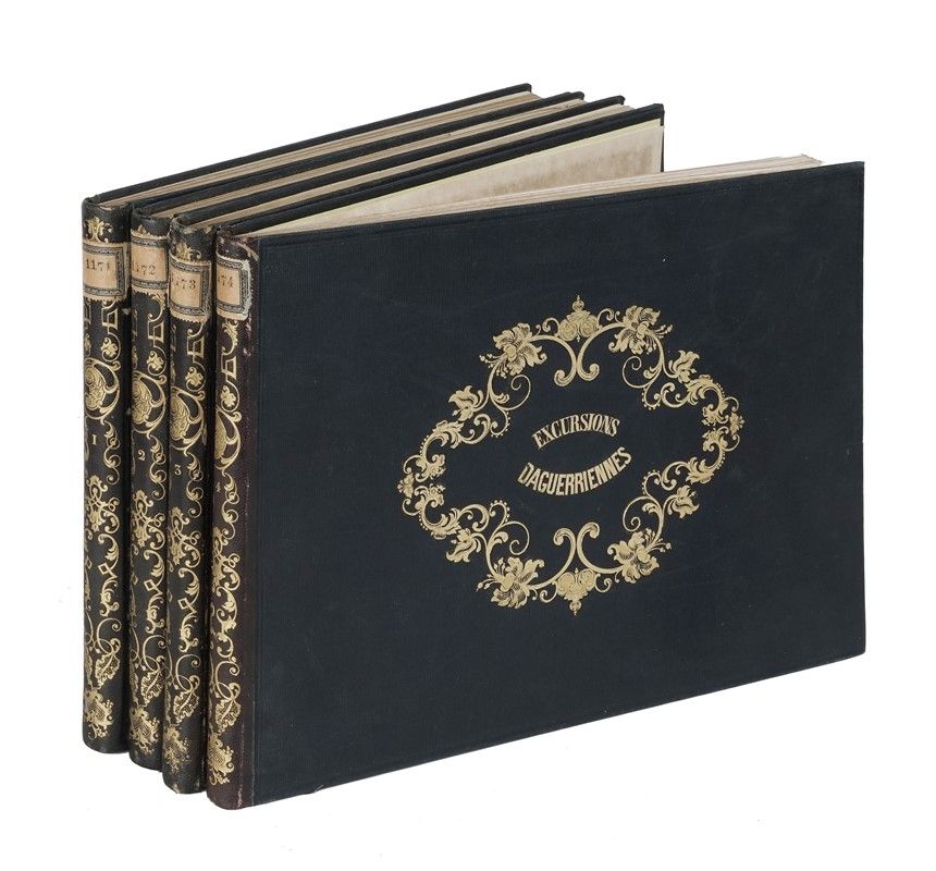 4 album in-folio oblungo (mm 258x368) così suddivisi: Volume 1: Pagine [4] con 32 tavole. Volume 2: Pagine [4] con 28 tavole. Volume 3: Pagine [4] con 22 tavole. Volume 4: pagine [6] (occhietto, frontespizio ed elenco dei sottoscrittori) con 28 tavole. Tutte le tavole sono incise all'acquatinta su carta india applicate su cartoncino spesso; ogni incisione è preceduta dalla descrizione con 2 o 4 pagine di testo. Complessivamente l'opera contiene 110 tavole incise di dagherrotipi di monumenti o vedute di paesi Europei, dell'Africa o dell'Asia, ognuna protetta da velina. Le tavole sono in splendida condizione ma presentano arrossature e bruniture anche intense sui fogli di testo e sui cartoncini dove sono applicate. Bella legatura coeva in mezza pelle blu con fregi oro ai dorsi, con piatti in tutta percallina blu zigrinata con al centro di ogni volume decorazioni e fregi oro, titoli oro ai piatti anteriori di tutti i 4 volumi, tagli dorati.