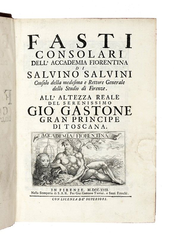 In-4° (mm 243x170). Vignetta allegorica con l'Arno in primo piano e il duomo di Firenze sullo sfondo al frontespizio; testatine, capilettera e finalini in legno. Buona copia. Legatura coeva in piena pelle, con ampi fregi e titoli in oro su tassello al dorso a 5 nervi; tagli spruzzati e sguardie marmorizzate. Tracce d'uso e lievi mancanze alle cerniere. Ex-libris al contropiatto anteriore. SI AGGIUNGE: Fatti attenenti all'inquisizione e sua storia generale e particolare di toscana. Firenze: Per Pagani 1782. SI AGGIUNGE: Mini Paolo, Difesa della Città di Firenze, contra le calunnie & maldicentie de maligni. In Lione: Appr. F. Tinghi, 1577.