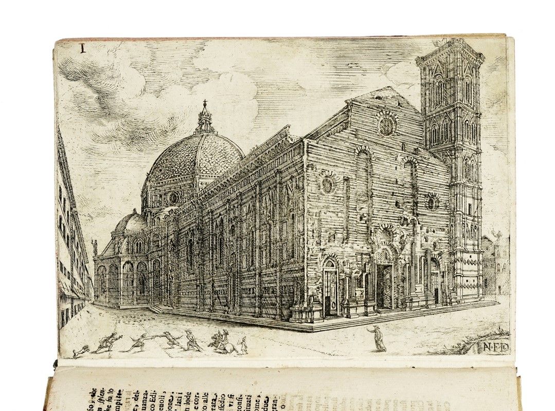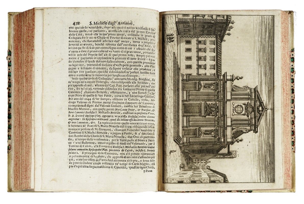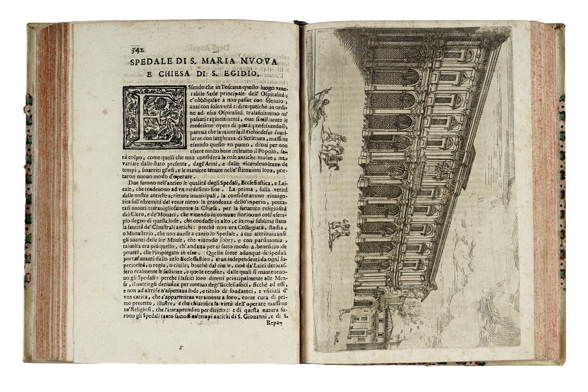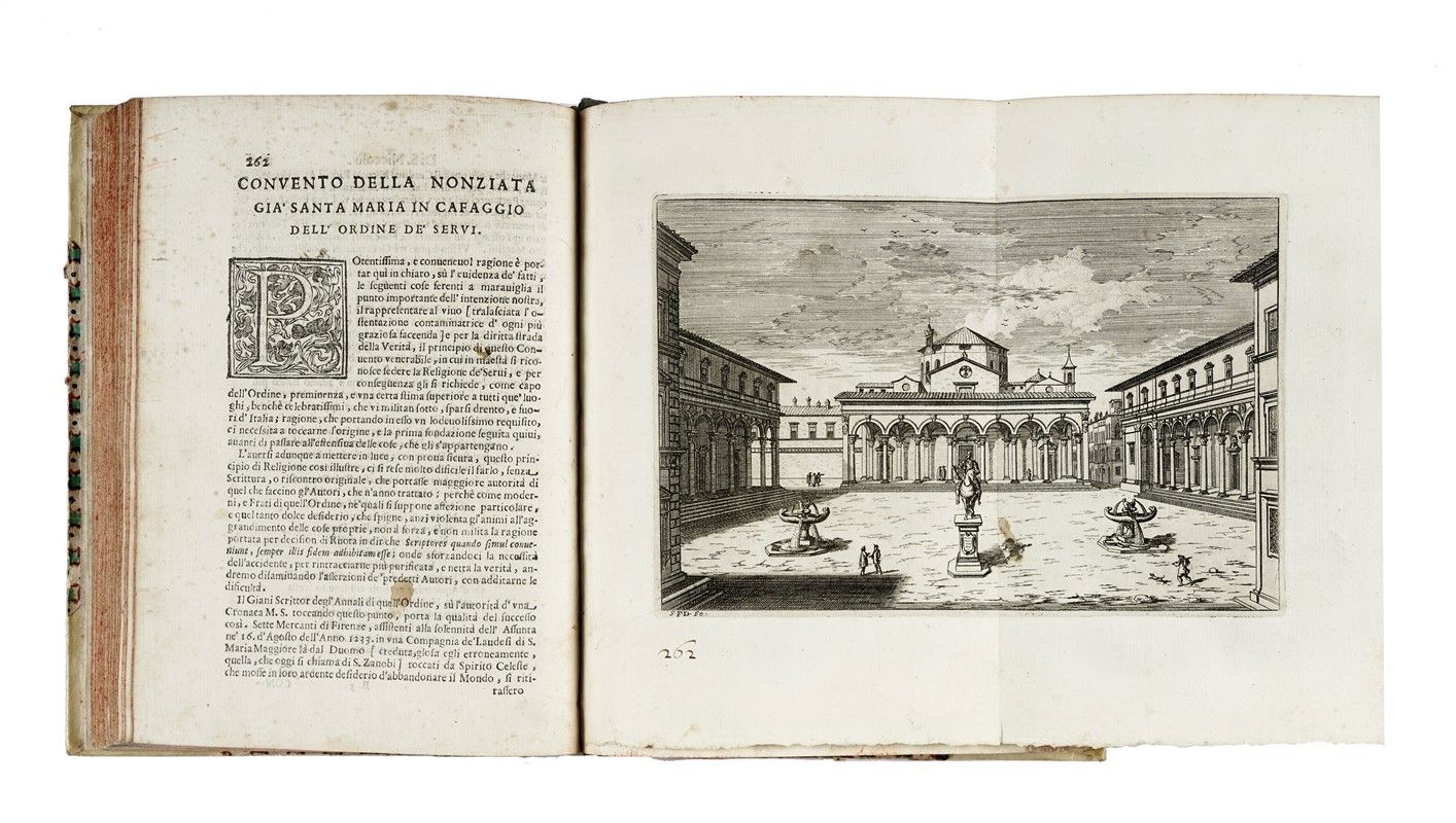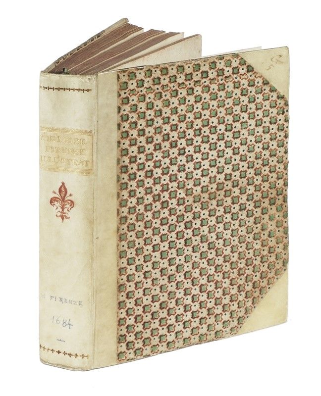 In-4° (mm 225x160). Pagine [20], 1-480, [4], 481-571, [17] con 5 tavole incise in rame fuori testo, di cui una ripiegata. Frontespizio in nero e rosso, testatine e capilettera in xilografia alle pagine. Esemplare corto di margini, con tavole ampiamente rifilate e rimontate. Macchie e fioriture sparse e alcune arrossature, più concentrate in corrispondenza dello specchio di stampa di rari fascicoli. Legatura settecentesca in mezza pergamena rigida, con punte e piatti in carta decorata; titoli in oro al dorso. Ex-libris applicati al contropiatto. Stemma alle armi di Filippo Nerli, dipinto a mano al foglio di guardia anteriore e titolato in basso "All Ill.mo Clariss.mo March.e Filippo Nerli / Dono del Autore". Tre fogli di commento, con annotazioni di antica mano, rilegati nel testo.