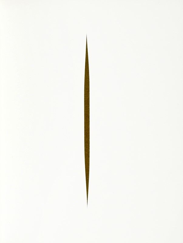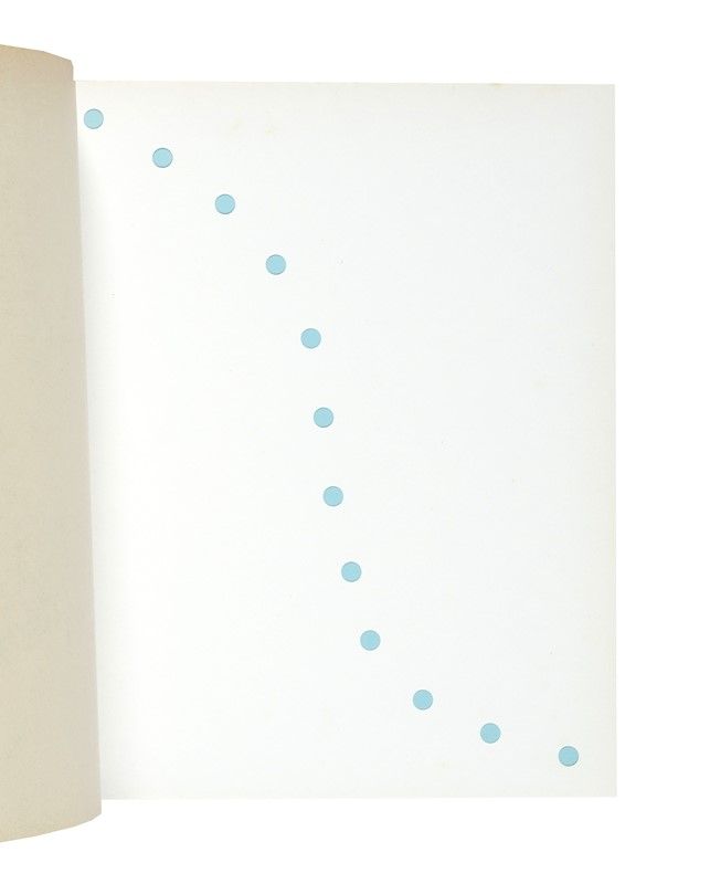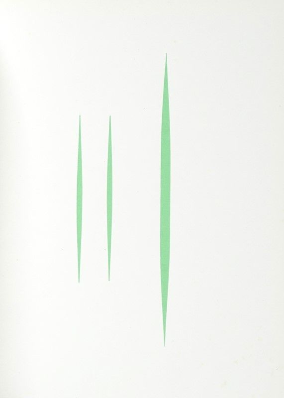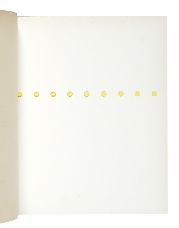 In-8° (mm 210x174). Con 8 pagine fustellate con tagli e buchi su indicazione di Lucio Fontana. Rarissime e lievi fioriture, altrimenti ottima copia in brossura originale con il celebre Concetto spaziale dell'Artista al piatto anteriore. Francobollo con un altro Concetto spaziale di Fontana applicato al recto della prima carta bianca. Uno dei 900 esemplari dell'edizione ordinaria, su una tiratura complessiva di 1000 copie numerate.