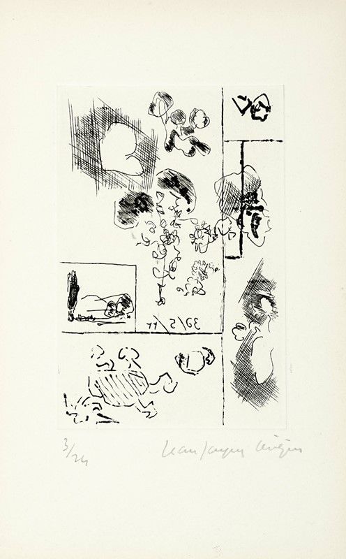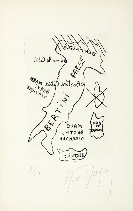 In-8° (mm 255x162). Pagine [50] profusamente illustrate in bianco e nero. Con, sciolte, 5 acqueforti originali, di P.A. Benoît, J.-C. Lambert, J.-J. Lévêque, M. Ragon e P. Restany, tutte firmate e numerate dagli Artisti. Ottima copia in barbe, a bifoli sciolti, perfettamente conservata in brossura originale protetta da velina, con una fotografia di Gianni Bertini al piatto. Minime tracce d'uso alle cerniere, altrimenti buone condizioni. Uno dei 24 esemplari su papier Rives, numerata e firmata al colophon da Bertini e dagli Artisti, su una tiratura complessiva di 36 esemplari.