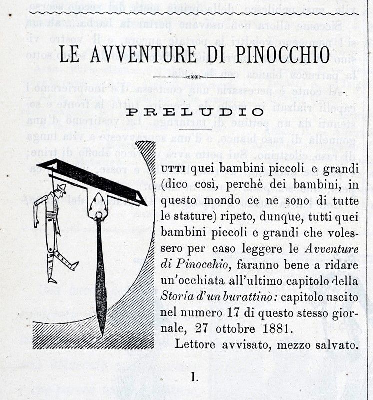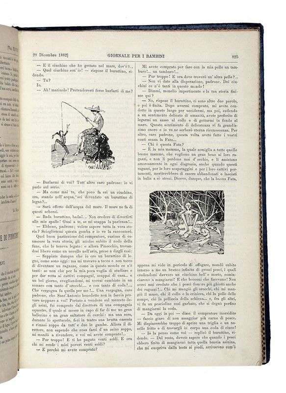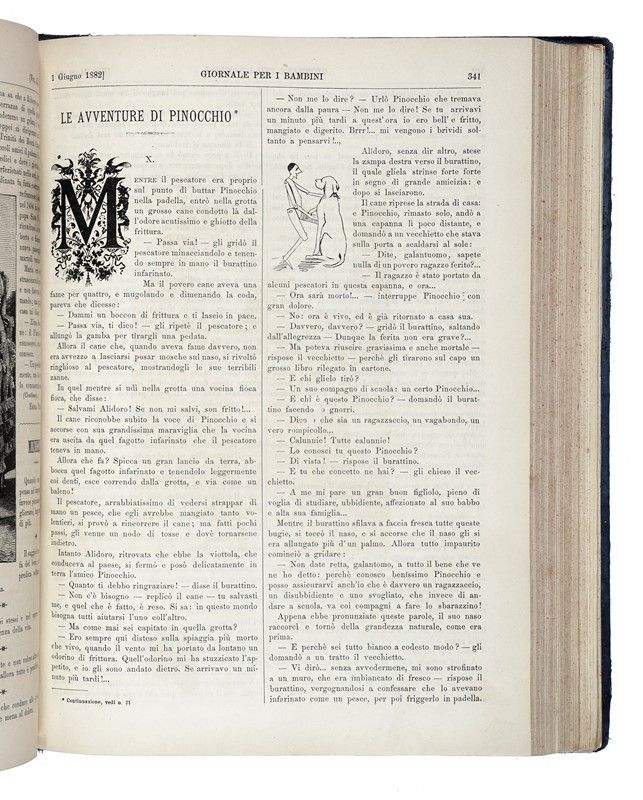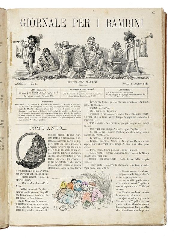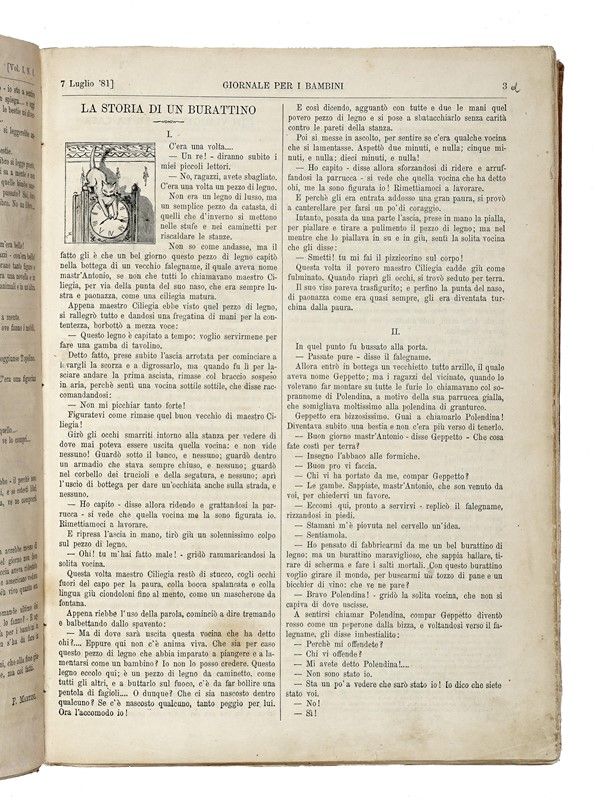 9 annate in 9 volumi in-folio (mm 298x216 il primo, 301x220 gli altri). Dal n. 1 dell'Anno I (7 luglio 1881) al n. 25 dell'Anno IX (20 giugno 1889). 408 [di 416] fascicoli di 16 pagine ciascuno (assenti 4 fascicoli nel vol. 5; vol. 7 con fascicoli dall'1 al 4 con mancanze), rispettivamente: 26 nel primo volume, 53 nel quinto, 25 nel nono, 52 in tutti gli altri (numero di Natale doppio). Migliaia di illustrazioni, oltre a 9 tavole cromolitografiche (nel primo, secondo e quarto volume) e a illustrazioni a colori nel testo nel fascicolo natalizio del quinto volume. Difetti e mancanze (non alle parti del Pinocchio), collazione disponibile su richiesta. Primo volume in tela editoriale color zafferano con sguardie rinnovate. Altri volumi in tela editoriale blu con difetti e restauri. Timbretto circolare della libreria Saba al verso del primo frontespizio.