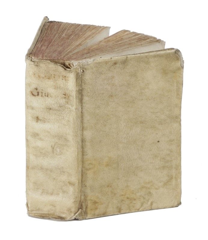 In-18° (mm 11270). Pagine: [32], 262 [i.e. 362], [2]. Con 54 [di 56 registrate su SBN] tavole calcografiche (di cui 1 ripiegata). Ultime 7 carte brunite e altre trascurabili tracce del tempo, ma nel complesso buona copia genuina in pergamena semi-flessibile coeva, tagli spruzzati di rosso (minimi difetti). Timbro del grande bibliofilo Giuseppe Martini.