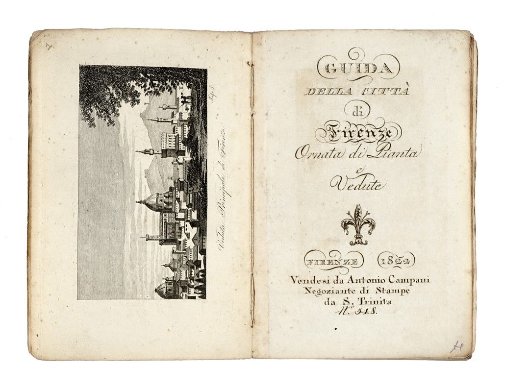 In-16° (mm 168x115). Pagine [2], VI, 260 con 13 carte di tavole, delle quali 1 più volte ripiegata con il Plan de Florence (mm 200x230). Buona copia, leggermente fiorita, con un rinforzo al margine interno del frontespizio; le pagg. 183-186 e la tavola di Piazza del Gran Duca quasi completamente slegate, ma presenti e ben conservate. Cartonato editoriale rosa con l'indicazione del prezzo al piatto anteriore. Tracce di nastro adesivo alle cerniere e altre mende. SI AGGIUNGE: Anguillesi Giovanni, Notizie storiche dei Palazzi, e Ville appartenenti alla I.E.R. Corona di Toscana. Pisa: N. Capurro, 1815; SI AGGIUNGE: Fantozzi Federico, Pianta geometrica della città di Firenze. Firenze: Tipi della Galileiana, 1843; SI AGGIUNGE: Notizie e guida di Firenze e de' suoi contorni. Firenze: Piatti, 1841.