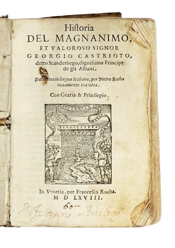 In-8° (mm 150x102). Carte [12], [403], [1 bianca, presente]. Marca xilografica al frontespizio (che ha un piccolo foro), iniziali e fregi xilografici, testo in corsivo. Prime ed ultime carte un po' stanche, un fascicolo brunito, strappetti alle carte 70, 177, 223, 240, e altre trascurabili tracce del tempo. Copia un po' torta ma comunque genuina nella sua pergamena floscia del tempo (sciupata, con piccola integrazione, con frammenti di pergamena da riuso all'interno).