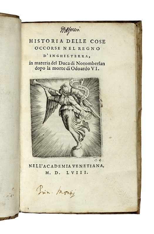 In-8° piccolo (mm 156x100). Carte: 68. Assente A4 bianca. Bella marca tipografica incisa in rame al frontespizio, testo in corsivo. Qualche pallidissimo alone, ma fresca copia genuina stampata su carta forte in pergamena flessibile coeva, con il titolo anticamente manoscritto al taglio inferiore. [SI AGGIUNGE:] Istoria di sua altezza reale il principe Carlo Odoardo Stuart di Galles concernente le avventure, e le disgrazie accaduteli in Scozia l'anno 1746. In Milano: nella stamperia di Giovanni Montano, 1760. In-8° di [8], 88 pagine in cartonato moderno (conservate le brossure originali).