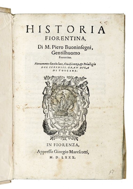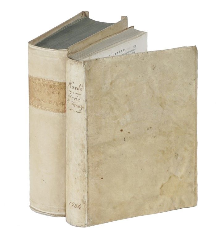 In-4° (mm 223x152). Pagine [40], 829, [1], 2 bianche. Marca xilografica al frontespizio, alcuni capilettera incisi nel testo. Leggere fioriture, altrimenti ottima conservazione Legatura successiva in piena pergamena con titolo in oro al dorso. Nota di possesso di precedente proprietario parzialmente cassata al frontespizio, una marca stampigliata al verso e un ex-libris al contropiatto anteriore. SI AGGIUNGE: Nardi Jacopo, Le storie della città di Firenze... In Firenze: nella stamperia di Bartolommeo Sermartelli, 1584.