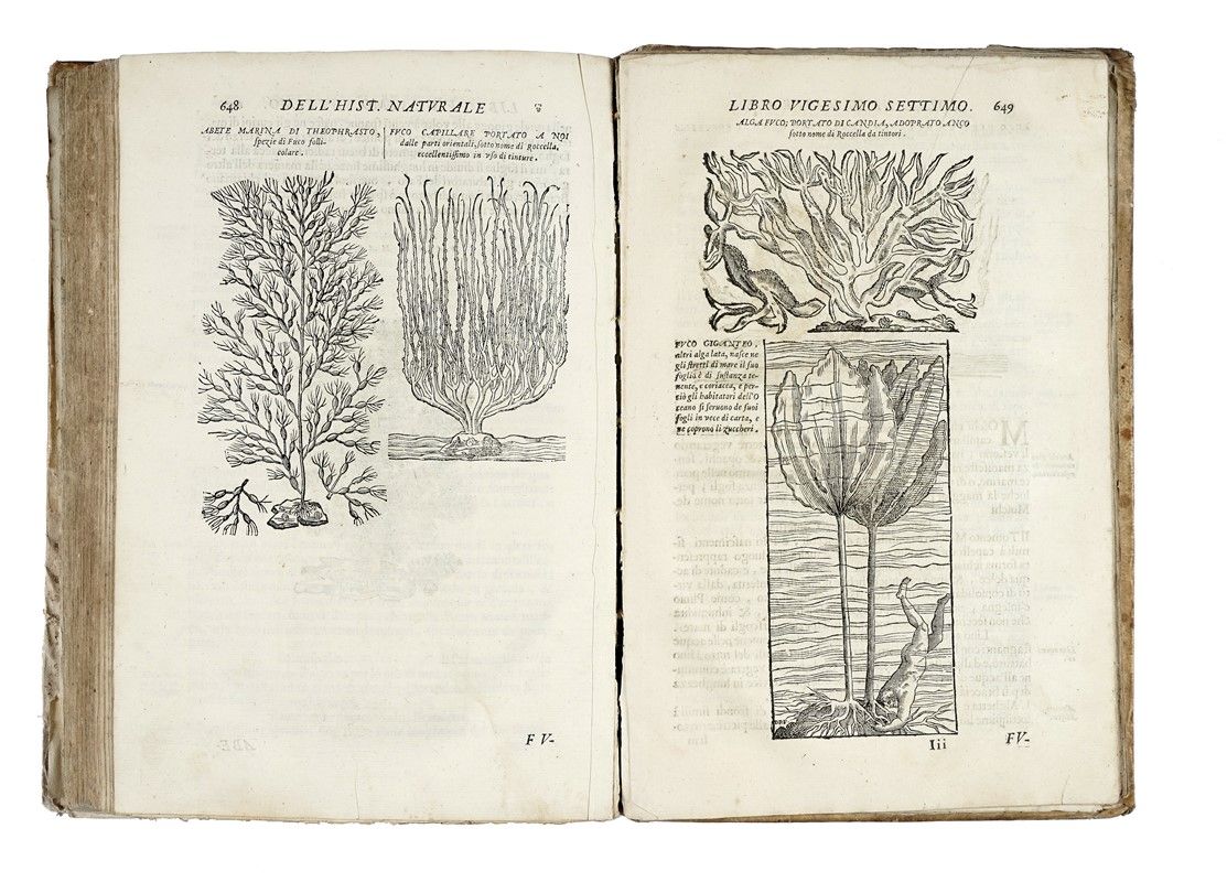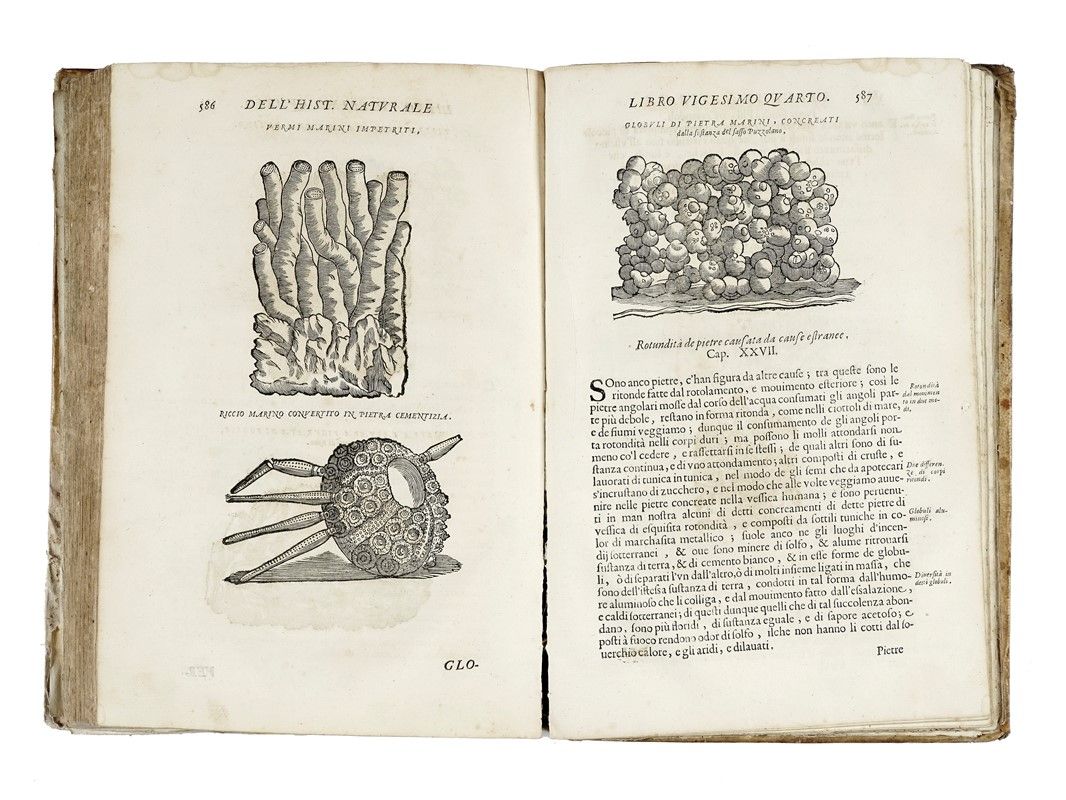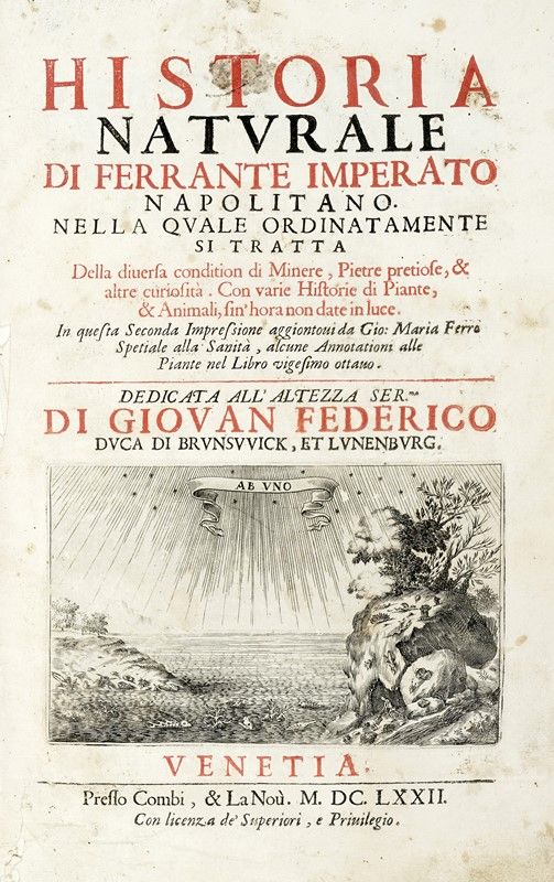 In-folio (mm 314x214). Pagine [8], 696, [8]. Frontespizio in rosso e nero con grande marca incisa in rame, oltre cento xilografie di animali, piante e minerali nel testo. Completo della splendida tavola incisa in rame a doppia pagina fuori testo raffigurante la wunderkammer dell'Imperato, in nitida e ben contrastata tiratura. Pergamena rigida coeva con titolo anticamente manoscritto al dorso (piuttosto sciupata). Frontespizio con tracce d’uso e del tempo (macchiette, strappetti, ecc.); tavola strappata lungo le piegature, parzialmente restaurata al verso e con piccola mancanza al margine inferiore; breve galleria di tarlo al margine interno dei fascicoli A-C, trascurabili forellini all’ultima riga della p. 363-364, strappo al margine di Lll1 (pp. 673-674), sciolte le carte a1 e a4 del fascicolo finale, qualche occasionale alone e macchietta.