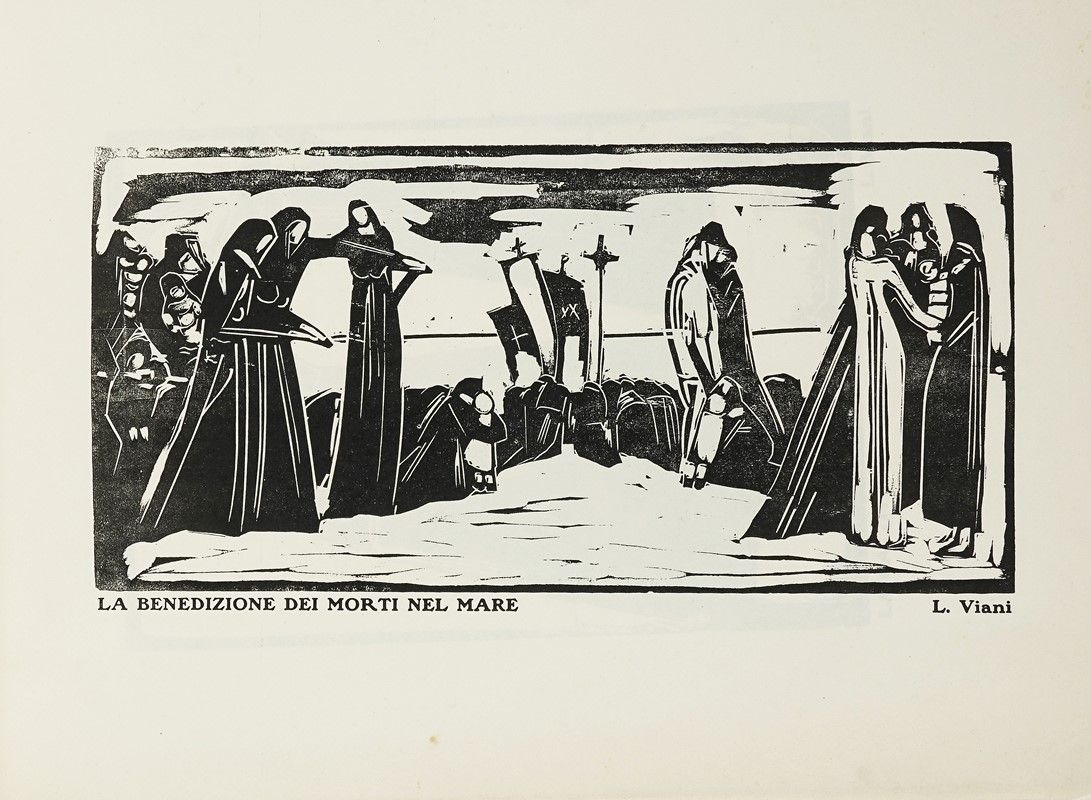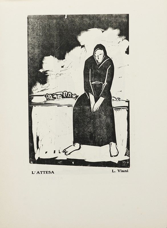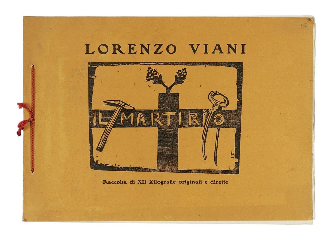 In-folio oblungo (mm 350x500). Esemplare con 12 xilografie di Lorenzo Viani, di cui 11 a piena pagina, con il titolo e il nome dell'Artista al margine inferiore. Lievi fioriture ad alcune tavole, ma ottimo esemplare, perfettamente conservato. Legatura in brossura editoriale in cartoncino giallo, legata con cordicella rossa, con 2 xilografie originali di Viani ai piatti. Lievi macchioline a quello anteriore, altrimenti ottima conservazione.