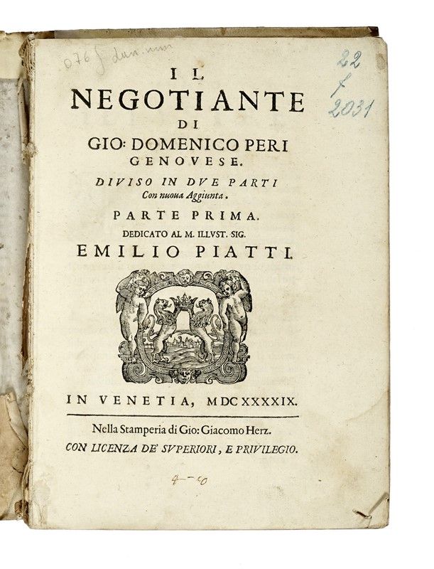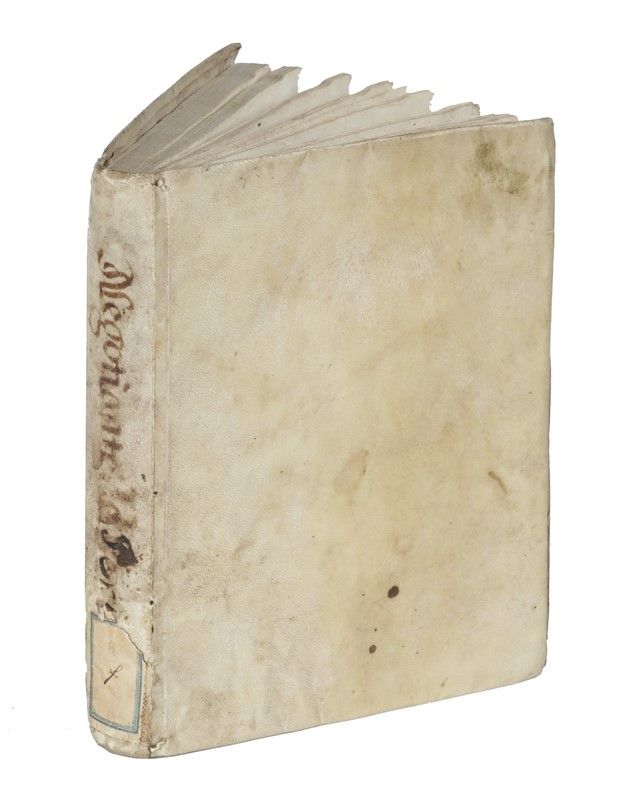 In-4° (mm 219x161). Pagine: [8], 232, [8]; 24; [8], 170, [6]. Marca al frontespizio, iniziali xilografiche, tabelle nel testo. Cerniera anteriore slegata, piccolo lavoro di tarlo e alone all'angolo inferiore esterno del primo fascicolo, B4 con angolo strappato senza perdite, altro lavoro di tarlo al margine superiore e poi interno di D-F. La collazione della seconda parte ha A-B4 (invece di A-B8), occasionali aloni marginali pallidi e altre trascurabili tracce del tempo. Copia genuina in bella pergamena flessibile coeva con titolo anticamente calligrafato al dorso.»