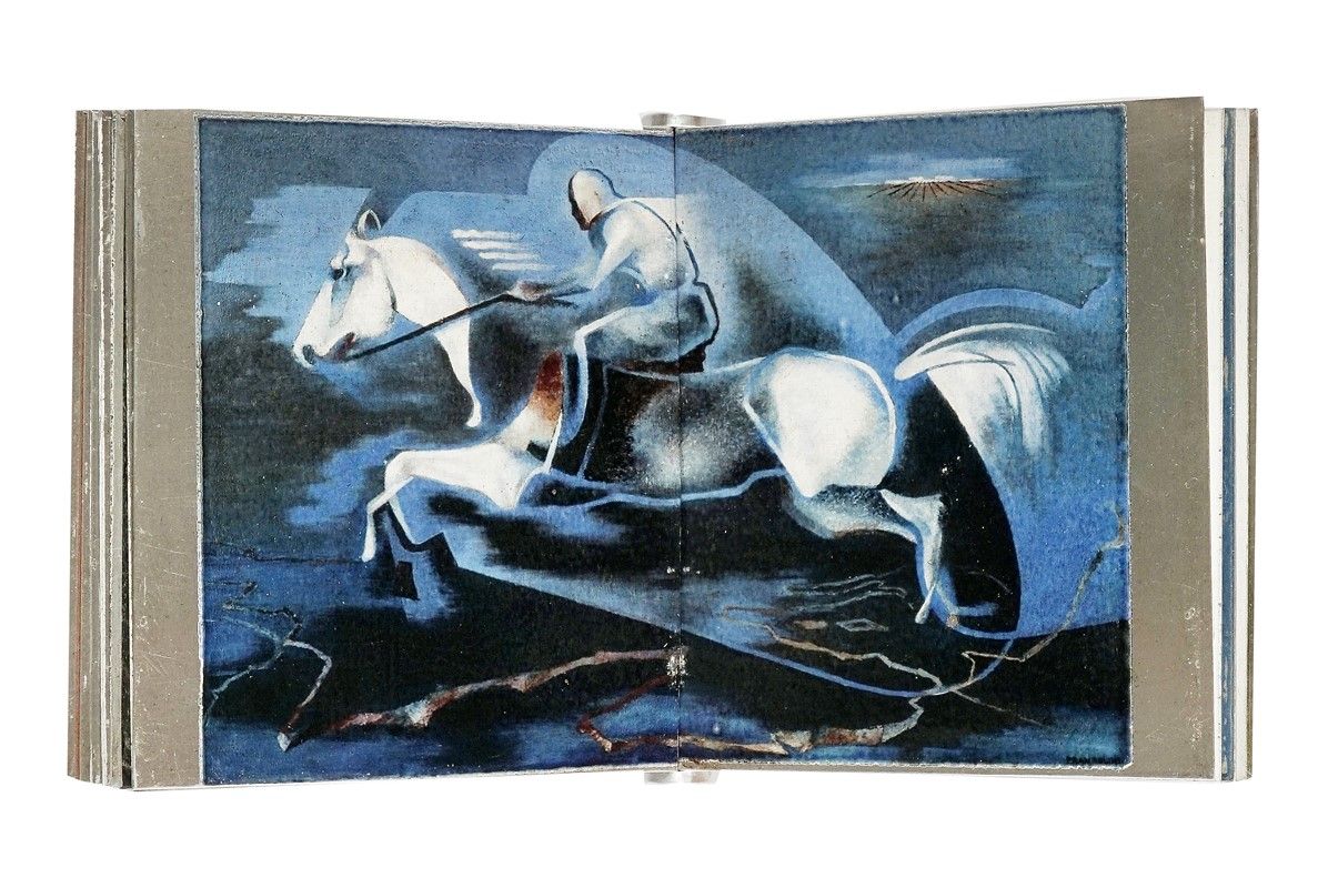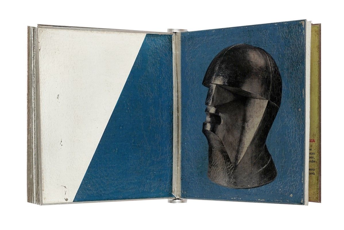 In-8° (mm 190x170). Carte [10] in metallo, illustrate recto/verso, con la riproduzione delle opere di Prampolini e Thayaht, con testo a fronte. Legatura in metallo con piatto anteriore illustrato, entro cofanetto in metallo coordinato. Con 1 carta di facsimile della rivista Futurismo, a descrizione dell'opera, allegata sciolta. Il tutto entro scatola editoriale in carta con riproduzione applicata al piatto. Esemplare 21/50.