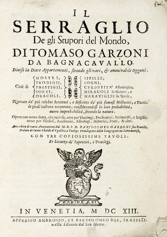 In-4° (mm 218x163). Pagine: [60], 787, [1]. Pergamena flessibile coeva con titolo anticamente manoscritto al dorso e al taglio inferiore. Legatura un po' usurata, angolo inferiore del frontespizio sciupato dall'uso, carte occasionalmente brunite in modo pallido, trascurabile galleria di tarlo al margine inferiore del fascicolo Y, strappo senza perdita al margine inferiore di a 3c6 (pp. 779-780). Buona copia genuina.