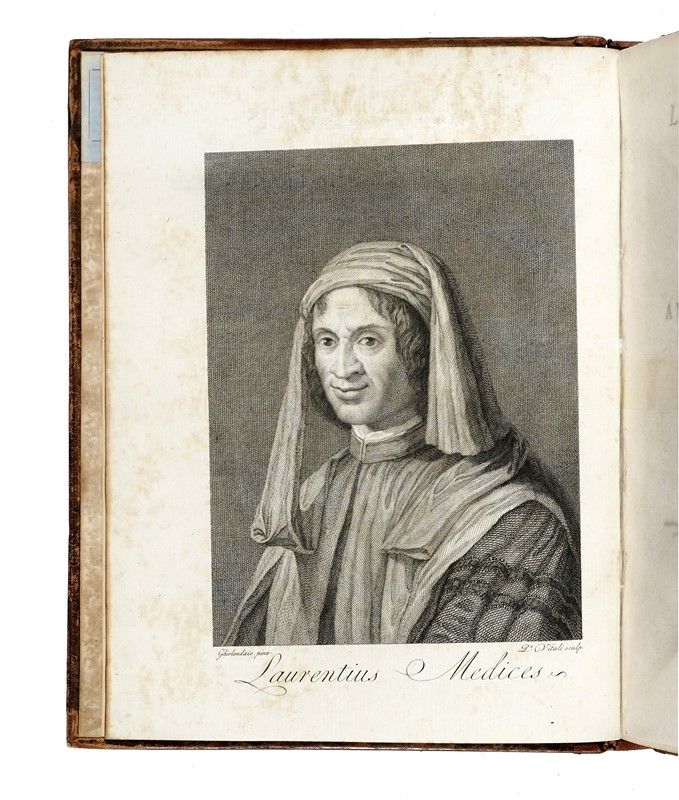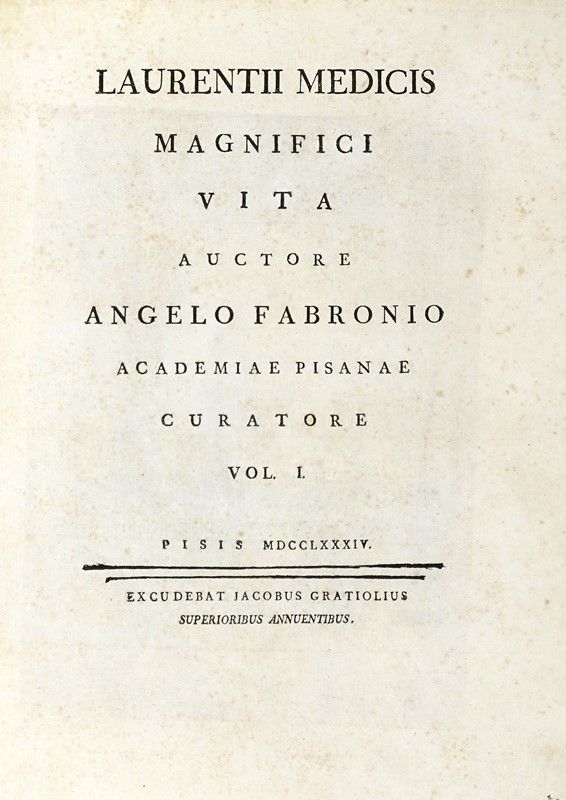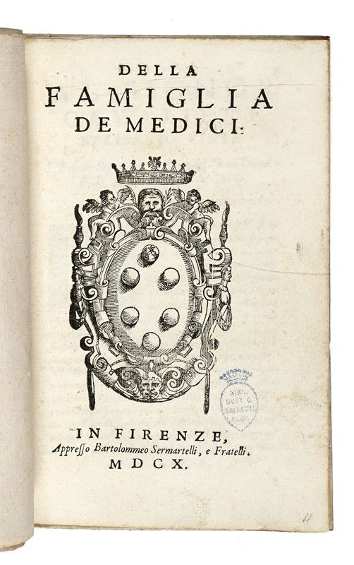 Compongono il lotto: 1) Strozzi Giovanni Battista, Della famiglia de Medici. In Firenze: appresso Bartolommeo Sermartelli, e Fratelli, 1610; 2) Ceccherelli Alessandro, Delle attioni, et sentenze del s. Alessandro de' Medici primo duca di Fiorenza... In Vinegia: appresso Gabriel Giolito de' Ferrari, 1565; 3) Id., Delle attioni et sentenze del Signor Alessandro de' Medici… Firenze: Giunti, 1580; 4) Fabroni Angelo, Laurentii Medicis Magnifici vita [...]. Vol. I (-II). Pisis: excudebat Jacobus Gratiolius, 1784; 5) Roscoe William, Vita di Lorenzo de' Medici detto il Magnifico [...]. Tomo I (-IV). Pisa: dalla tipografia di Antonio Peverata e com., 1799; 6) Id., Illustrazioni storico-critiche di Guglielmo Roscoe alla sua Vita di Lorenzo De' Medici detto il Magnifico con un'appendice di documenti tanto editi che inediti [...] Tomo I (-II); 7) Firmano Cornelio, Della solenne incoronazione del duca Cosimo Medici in gran-duca di Toscana... Firenze: nella stamperia Magheri, 1819; 8) Pieraccini Gaetano, La Stirpe de' Medici di Cafaggiolo [...]. Vol. I (-III). Firenze: Vallecchi, 1924-25; 9) Relazione dell'ultima malattina, Morte, Processione, e Sepoltura dell'altezza reale del Serenissimo Cosimo III... In Firenze: Tartini e Franchi, 1723.