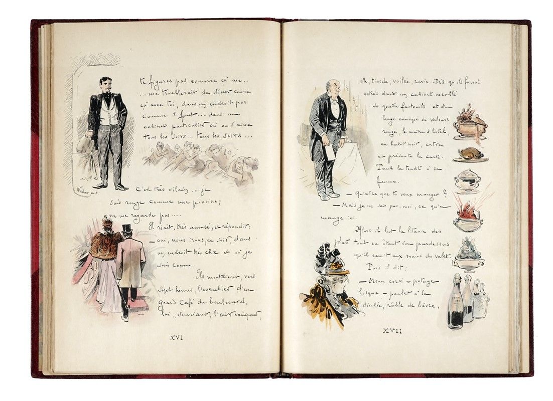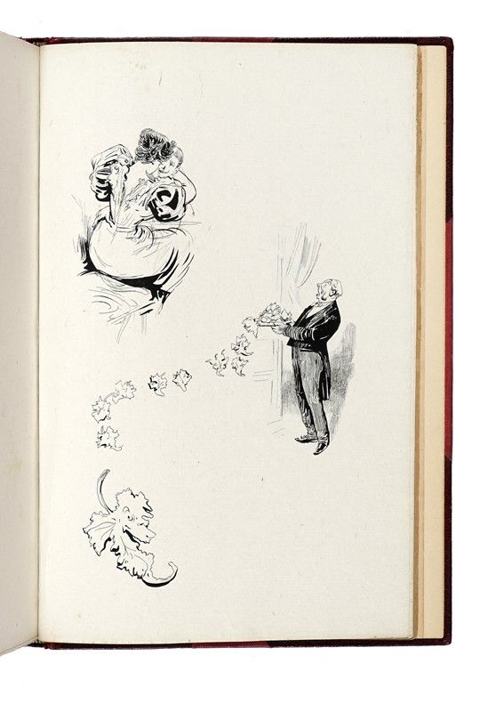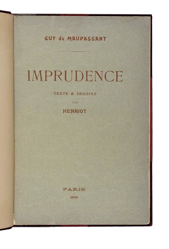 In-8° grande (mm 242x160). Pagine [4], XXX, [4] profusamente illustrate da incisioni di Henriot in coloritura coeva, che riproducono in facsimile un manoscritto dell'Artista. Una leggera abrasione marginale a pagina XXIX, altrimenti ottimo esemplare su carta Giappone. Rilegata in fine una suite in nero delle incisioni. Legatura in mezzo marocchino con punte e piatti in tela; fregi e titoli in oro al dorso a 5 nervetti e sguardie decorate. Macchie ai piatti e internamente allentato quello anteriore. Conservati all'interno i piatti della brossura originale, con titoli in arancione a quello anteriore. Quest'ultimo presenta strappetti marginali restaurati con nastro adesivo. Tiratura in 100 esemplari numerati.