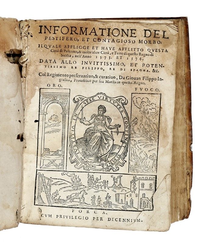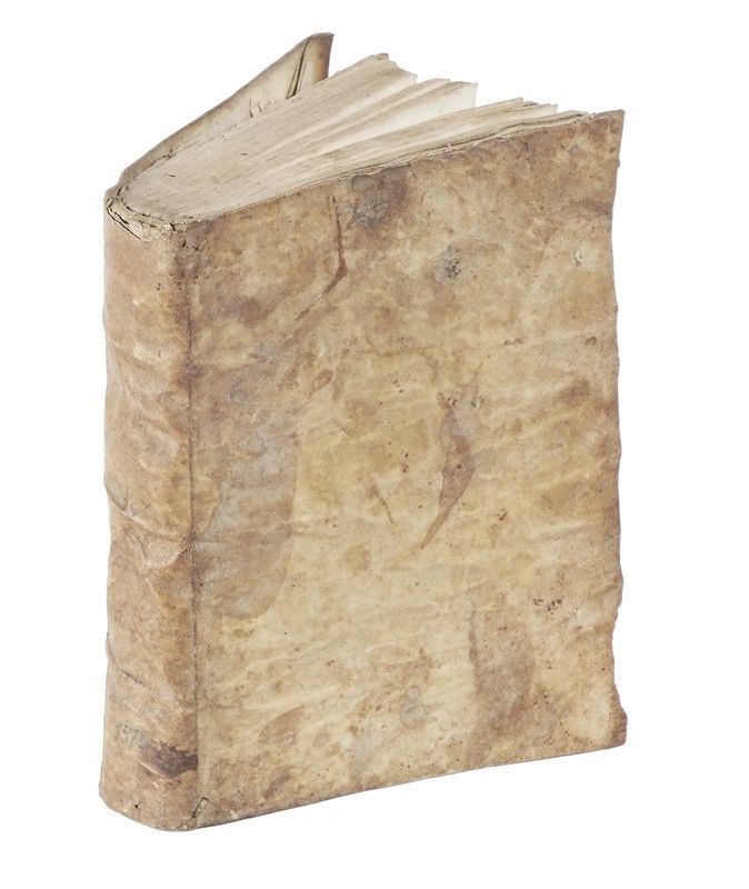 In-4° (mm 200x145). Non collazionato ma privo della quinta parte. Esemplare con difetti: prime carte con alone scuro al margine superiore, galleria di tarlo ai fascicoli A-G (tocca il testo) altri lavori di tarlo in margine. In pergamena flessibile da riuso con testo manoscritto all'interno.