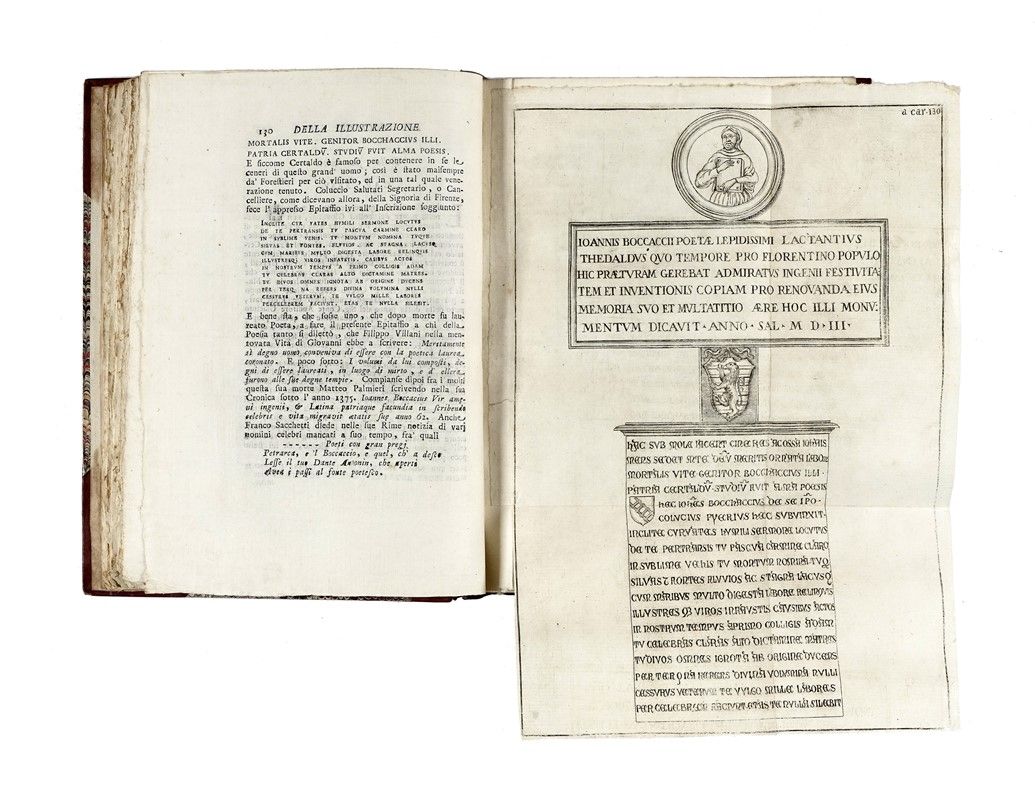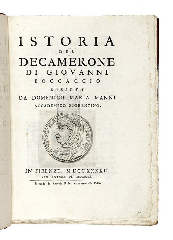 In-4° (240x175). Con 2 tavole calcografiche fuori testo, di cui 1 ripiegata. Fregio inciso in rame al frontespizio con il ritratto del Boccaccio; al verso del frontespizio xilografia con lo stemma del Dedicatario, Andrea Gerini. Graziosi capilettera, testatine e finalini incisi in legno. Buona copia in barbe. Legatura coeva in mezza pelle con punte e piatti marmorizzati; titolo in oro al dorso e sguardie rinnovate. SI AGGIUNGE: Boccaccio Giovanni, Lettera [...] scritta a m. Pino De Rossi sopra l'esilio. Livorno: nella stamperia in via Grande, 1770.